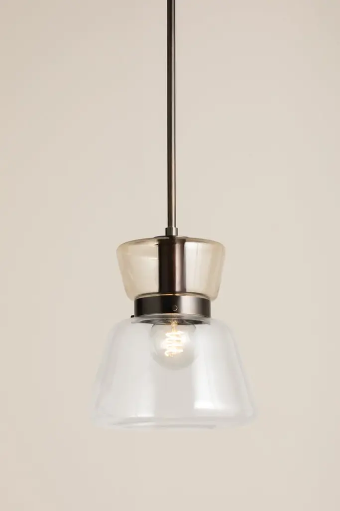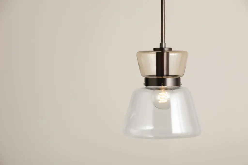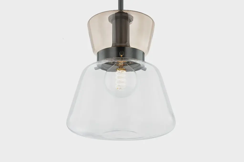 Contrasting glass shades and a sleek metal frame define the asymmetric hourglass silhouette of Elodie. This totemic pendant owes its graphic quality to the juxtaposition of clear and light bronze-plated glass forms. The choice between Aged Brass or True Bronze finishes allows you to lean into a more classic or industrial aesthetic. Whether suspended above countertops, in a living room, or at a bedside, Elodie sets the mood in style.