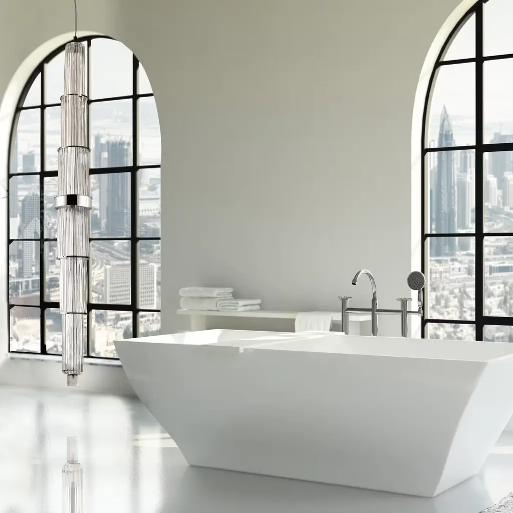 The elongated and striking profile of this pendant lamp will take center stage in any contemporary interior, thanks to its captivating silhouette made of grooved diffusers in transparent glass that taper towards its extremities. The metal frame of this pendant lamp boasts a glowing chrome finish and includes a 75W LED strip that provides optimum light. A ballast of 24V is included. Contract and commercial certifications available upon request.
