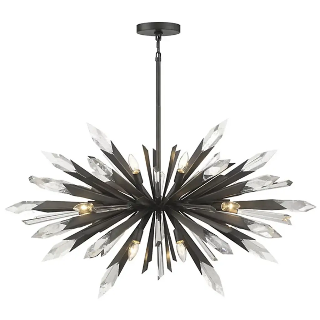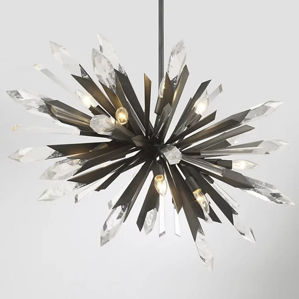 The Elsa Pendant from Metropolitan Lighting features a transitional style with its striking sunburst design, showcasing hammered steel accents and radiant crystal details. Built with durable steel construction, this eye-catching fixture reflects light through its shimmering crystals, creating a dazzling effect in any room. Ideal for foyers or entryways, this pendant blends classic charm with modern sophistication, making it a versatile and stylish centerpiece that enhances your home’s ambiance.