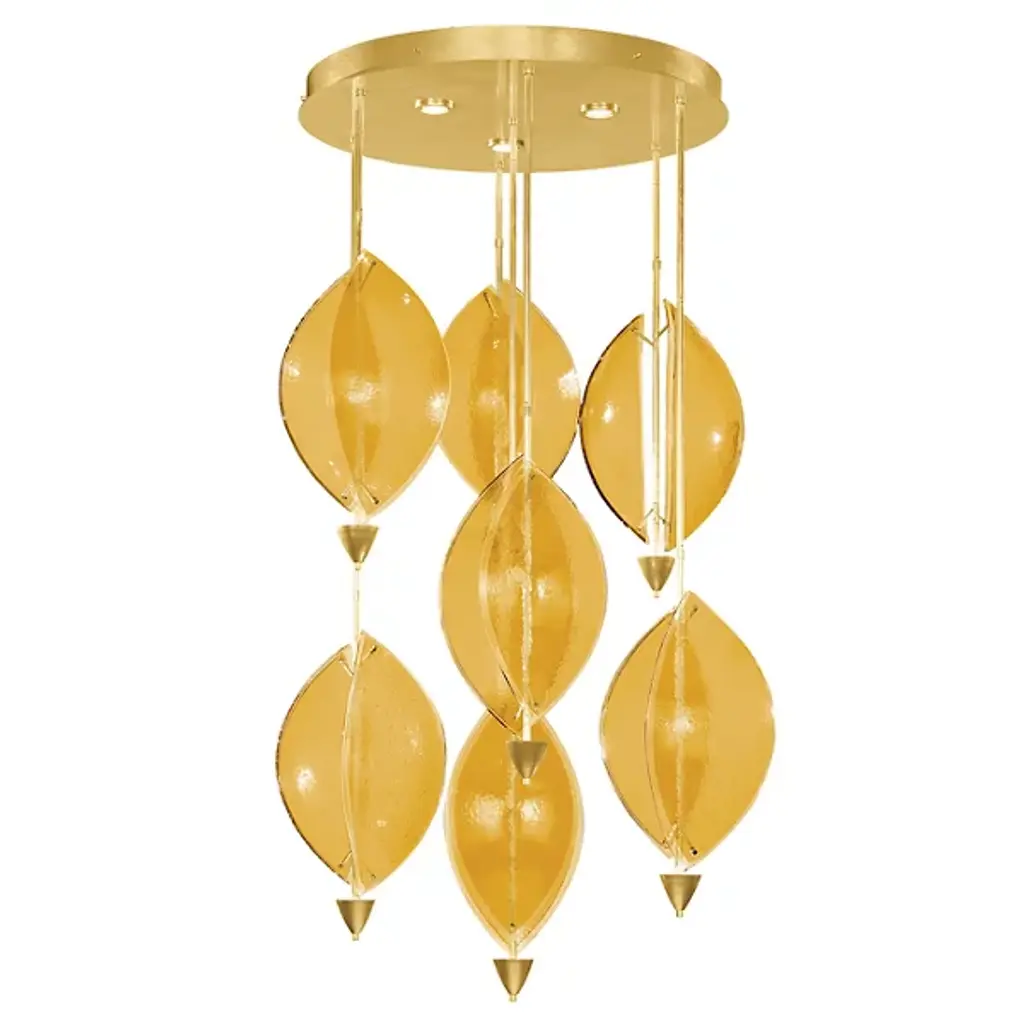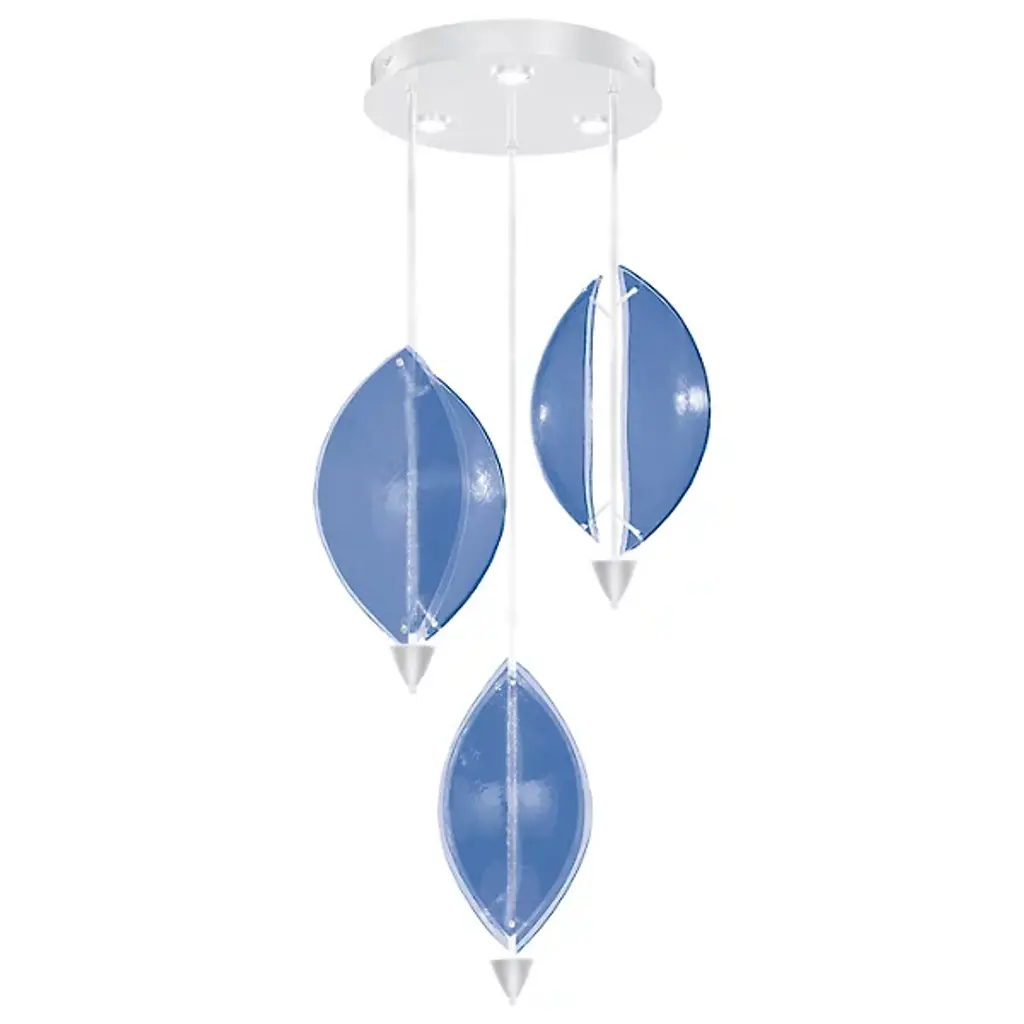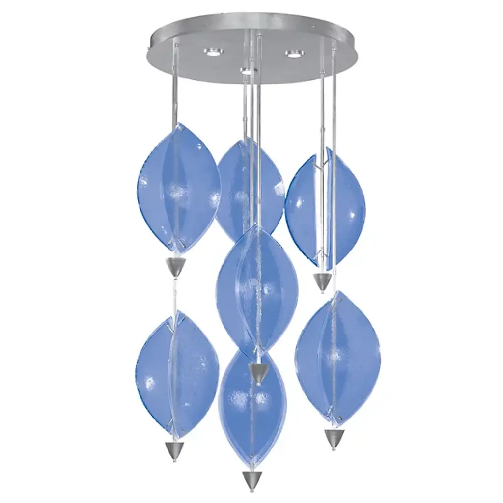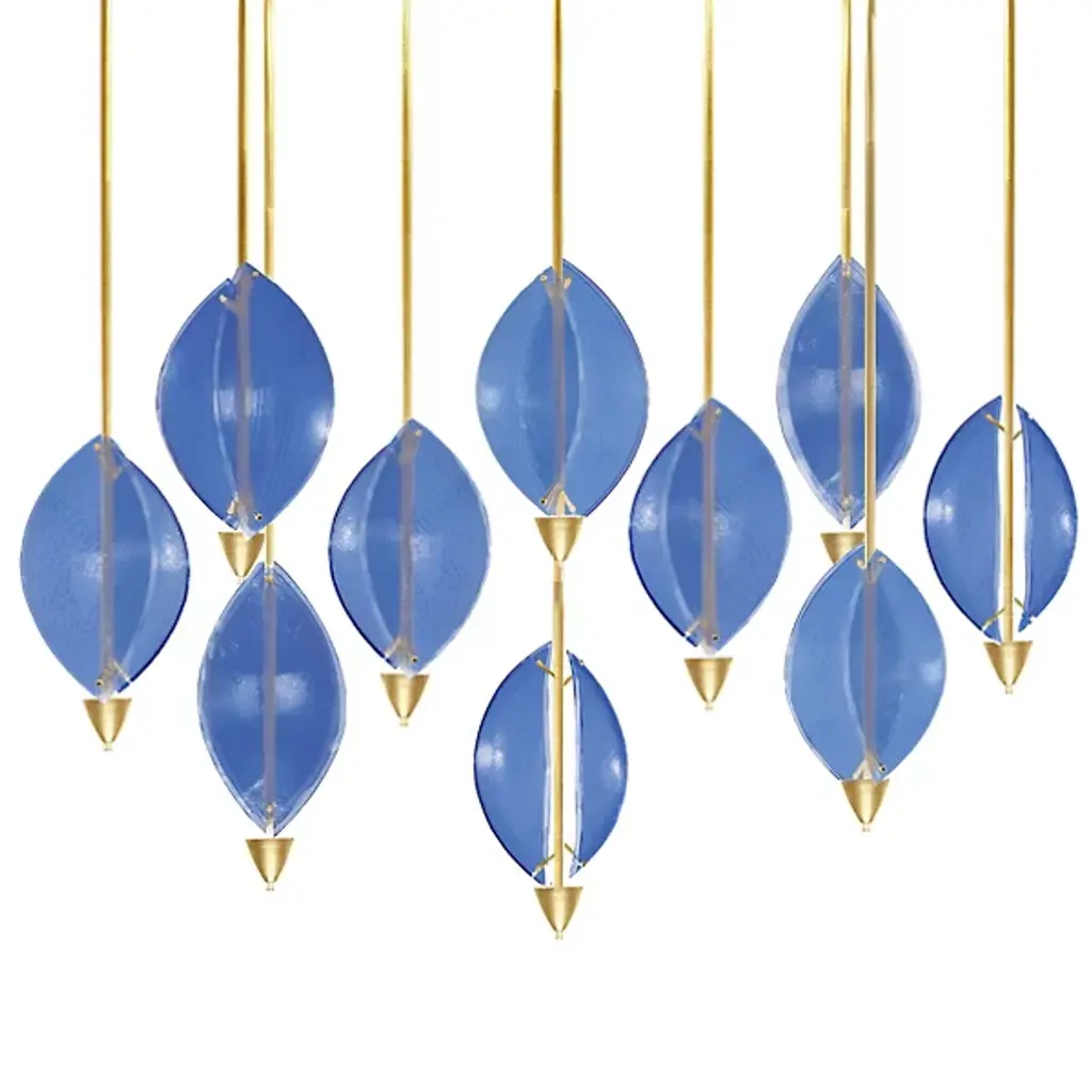 The Embark Multi-Light Pendant from Fine Art Handcrafted Lighting features multiple leaf-shaped glass pieces suspended at various heights. Each glass element hangs from thin wires connected to a round metal ceiling plate. Designed by Barclay Butera, the pendant’s hand-blown glass has a translucent quality that filters the LED light, creating a warm glow in the surrounding area. Small metal tips finish each glass piece, adding weight and stability to the design. This pendant fits naturally in coastal homes and dining areas where themed lighting enhances the overall design.