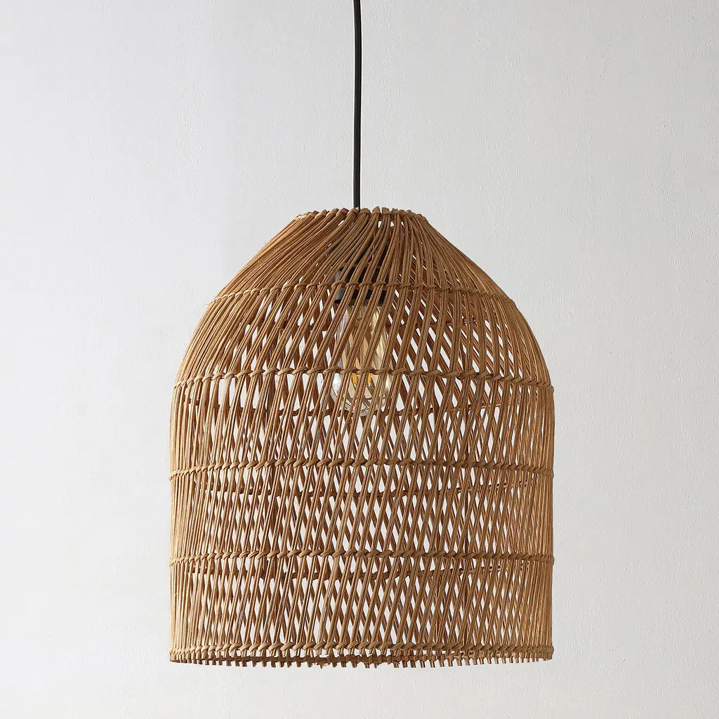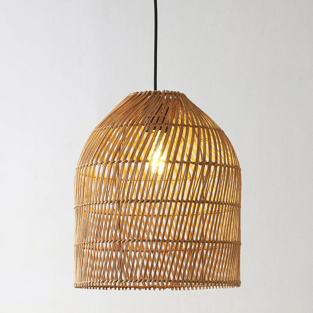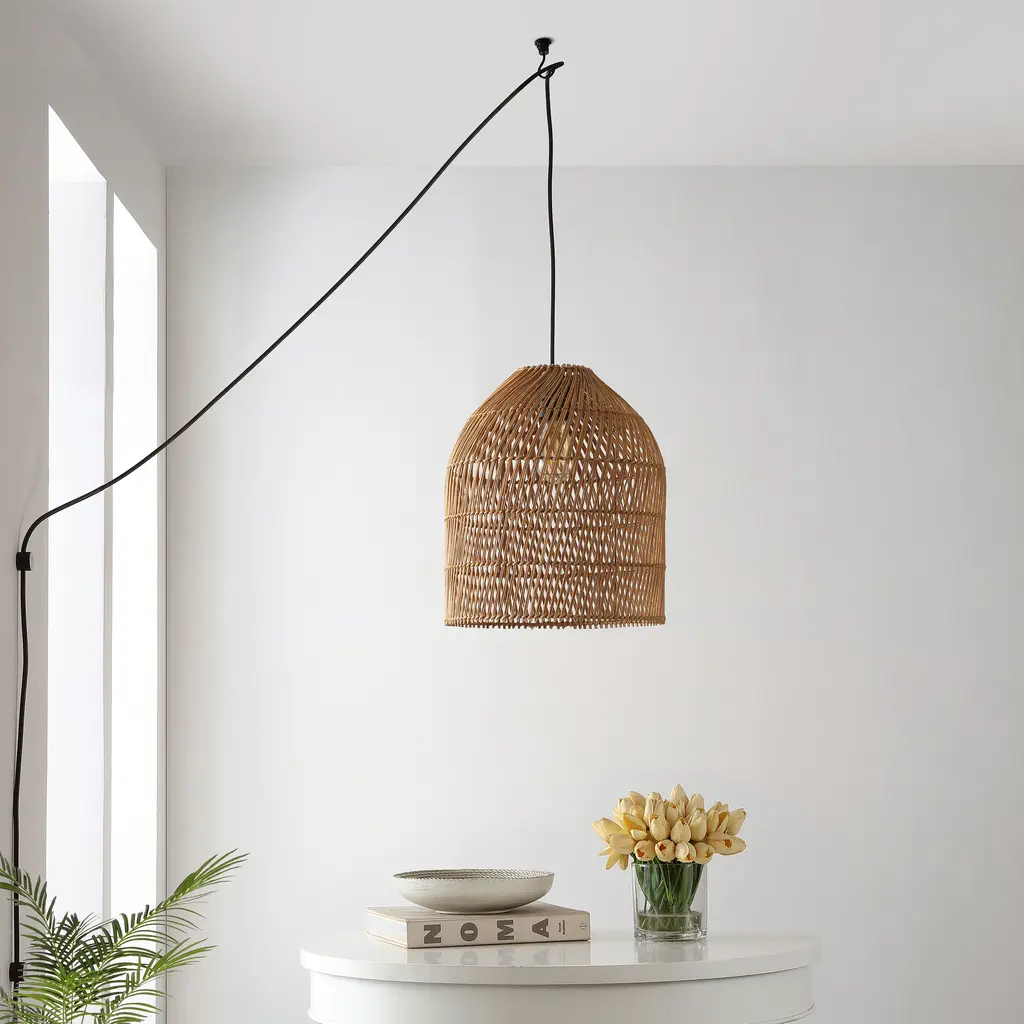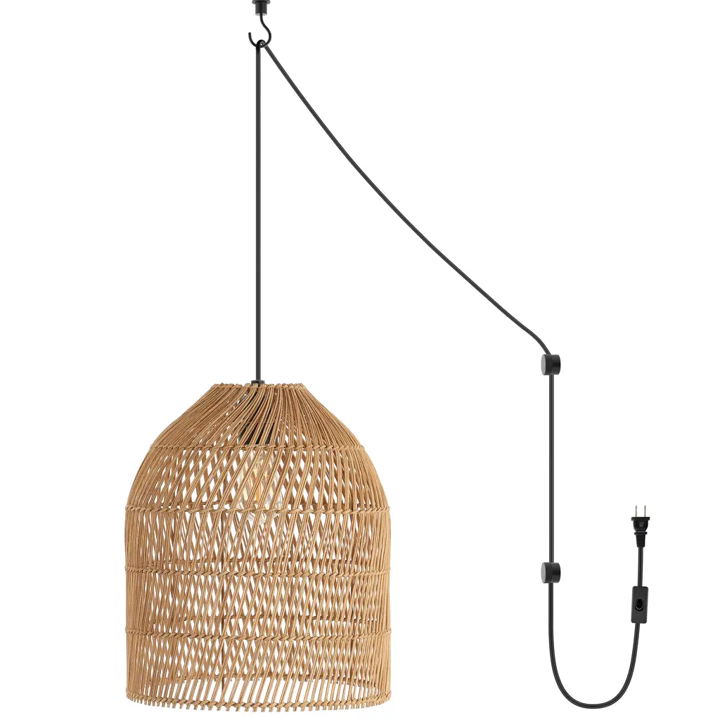 Rattan woven into a subtle swirl pattern forms this pendant's domed shade, casting playful shadows and letting through plenty of light when the fixture is turned on. As versatile as it is breezy, the pendant can be plugged in or hard-wired, and it's suitable for ceilings as high as 14 feet.