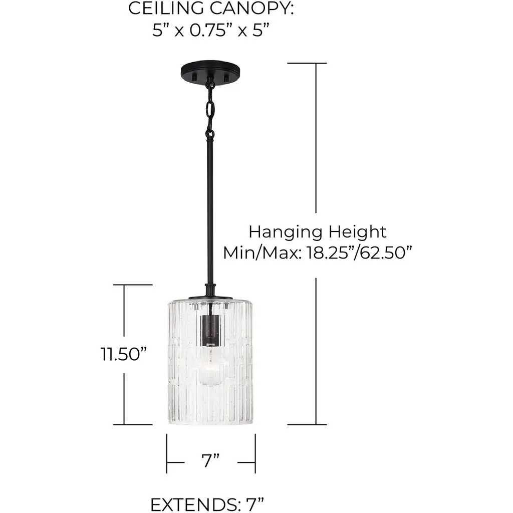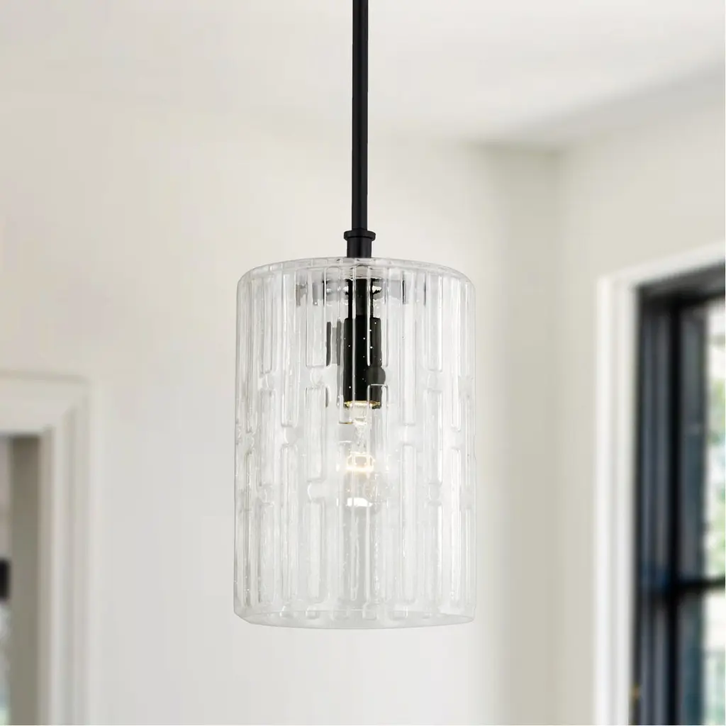 Create a simple and striking statement with the Emerson 1-Light Pendant. This fixture features elongated seeded glass with an embossed geometric pattern sparkles on a clean and classic Matte Black frame.