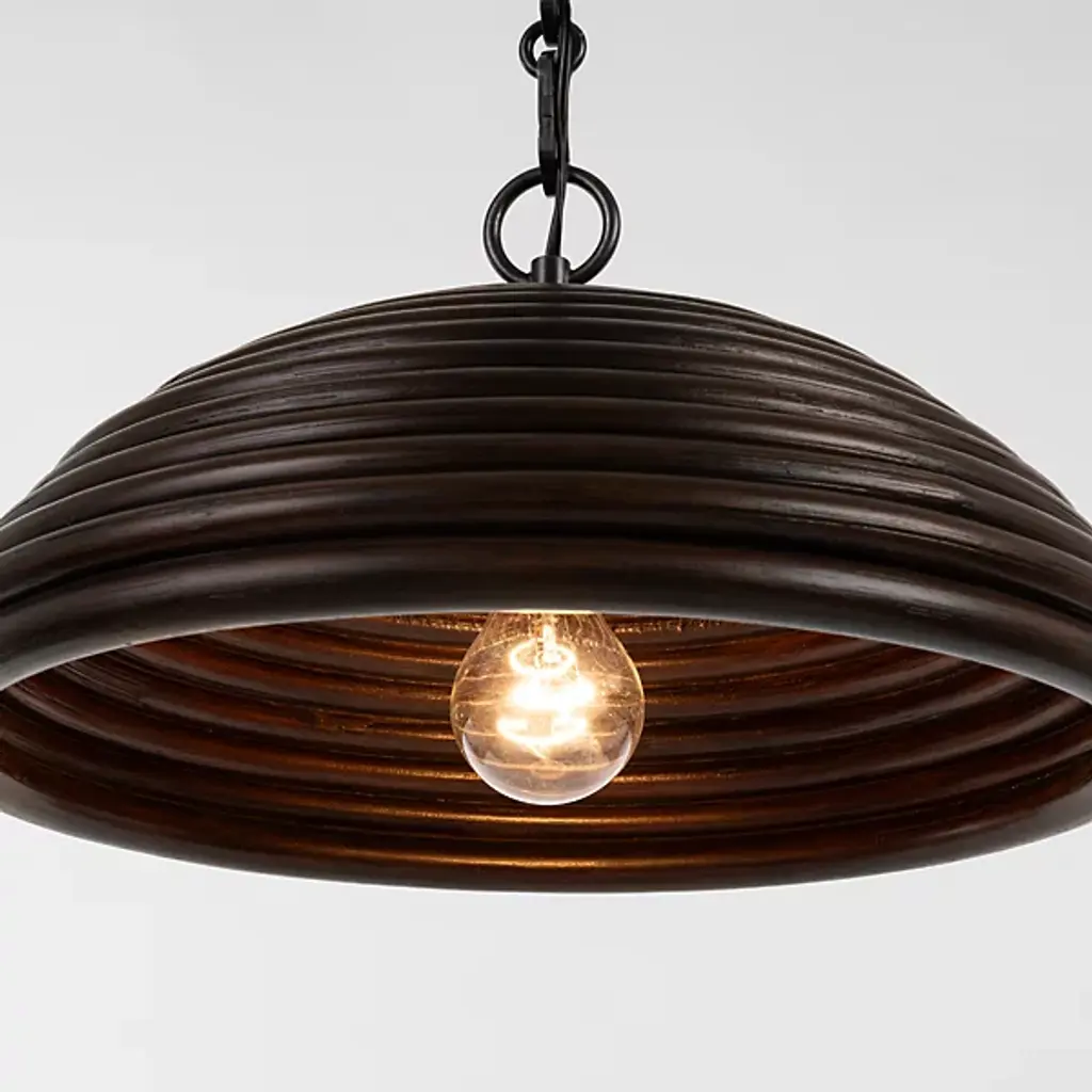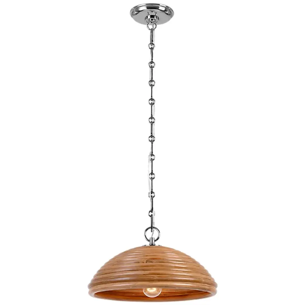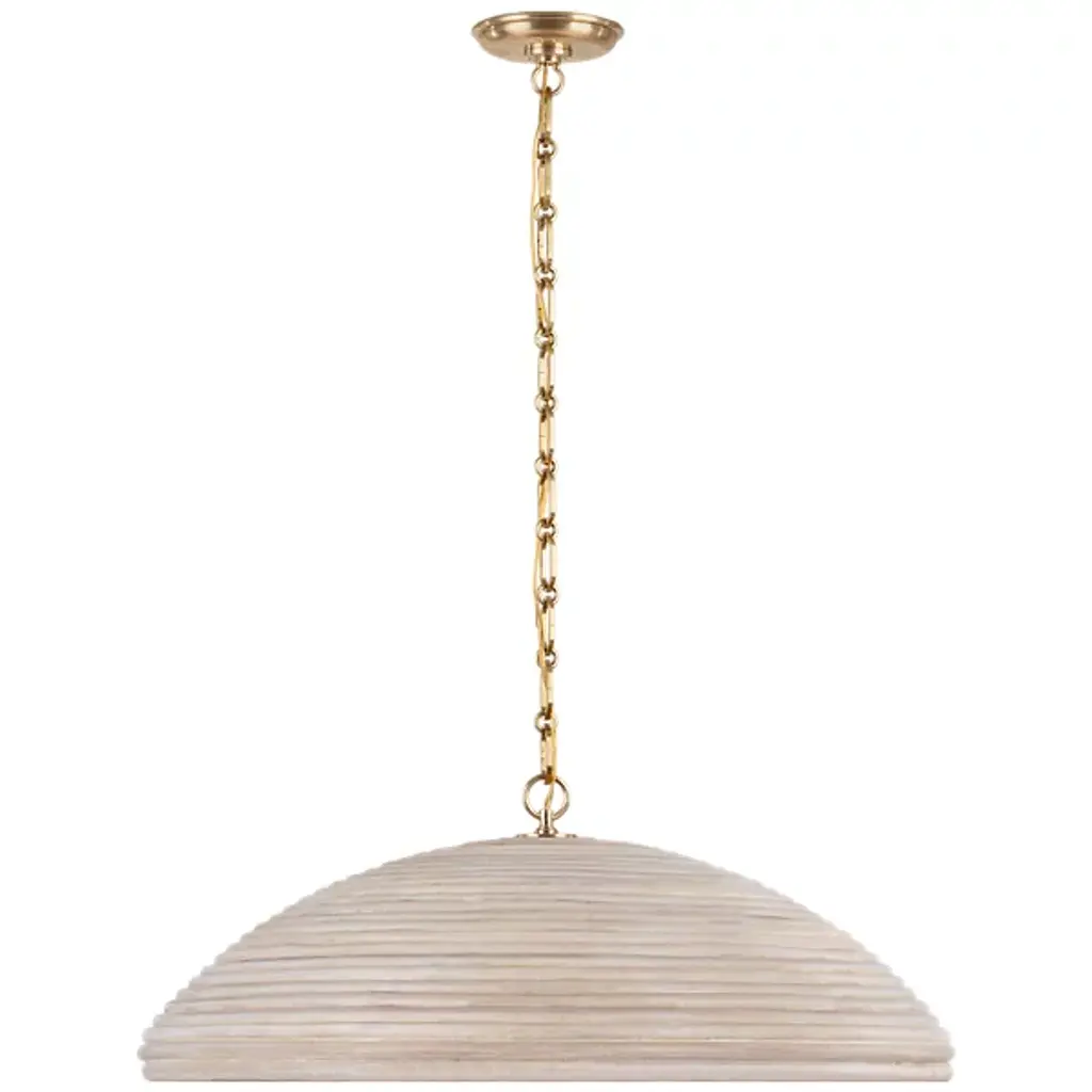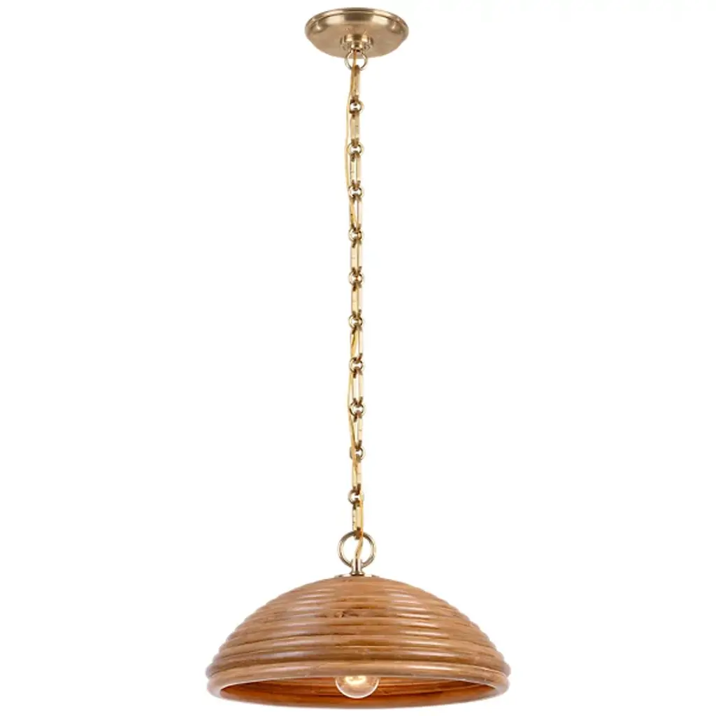 The Emerson Dome Pendant from Visual Comfort Signature takes a wider approach to rattan construction with its extended dome shape. Suzanne Kasler's design places emphasis on the horizontal banding technique, where parallel rattan strips work together to form a solid yet permeable shade. The pendant combines industrial elements through its chain mounting system with natural materials in the shade construction. Brass accents add definition to connection points, while the broader dome shape provides expanded light coverage.