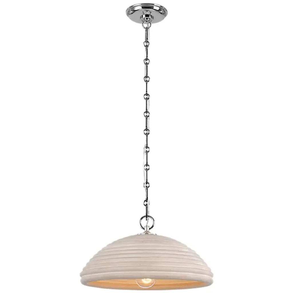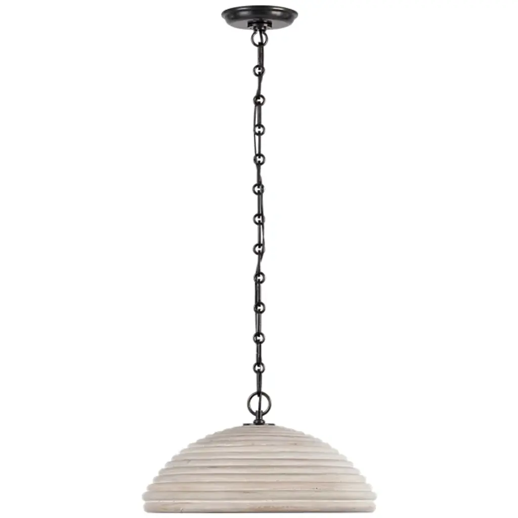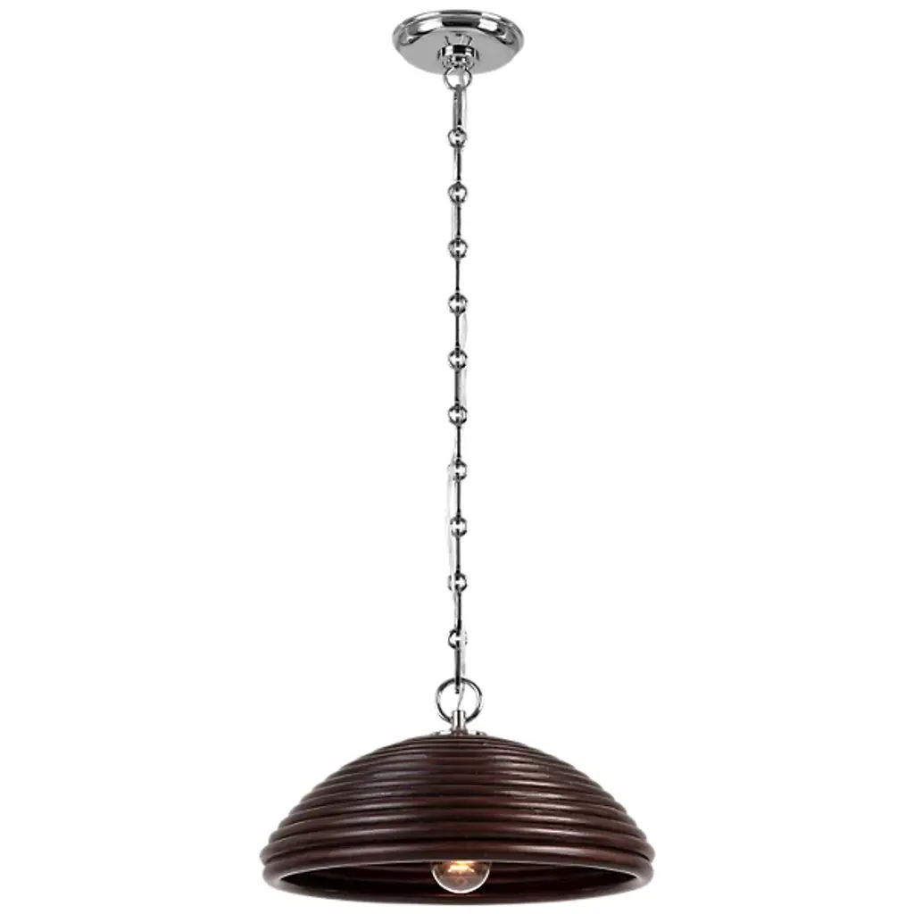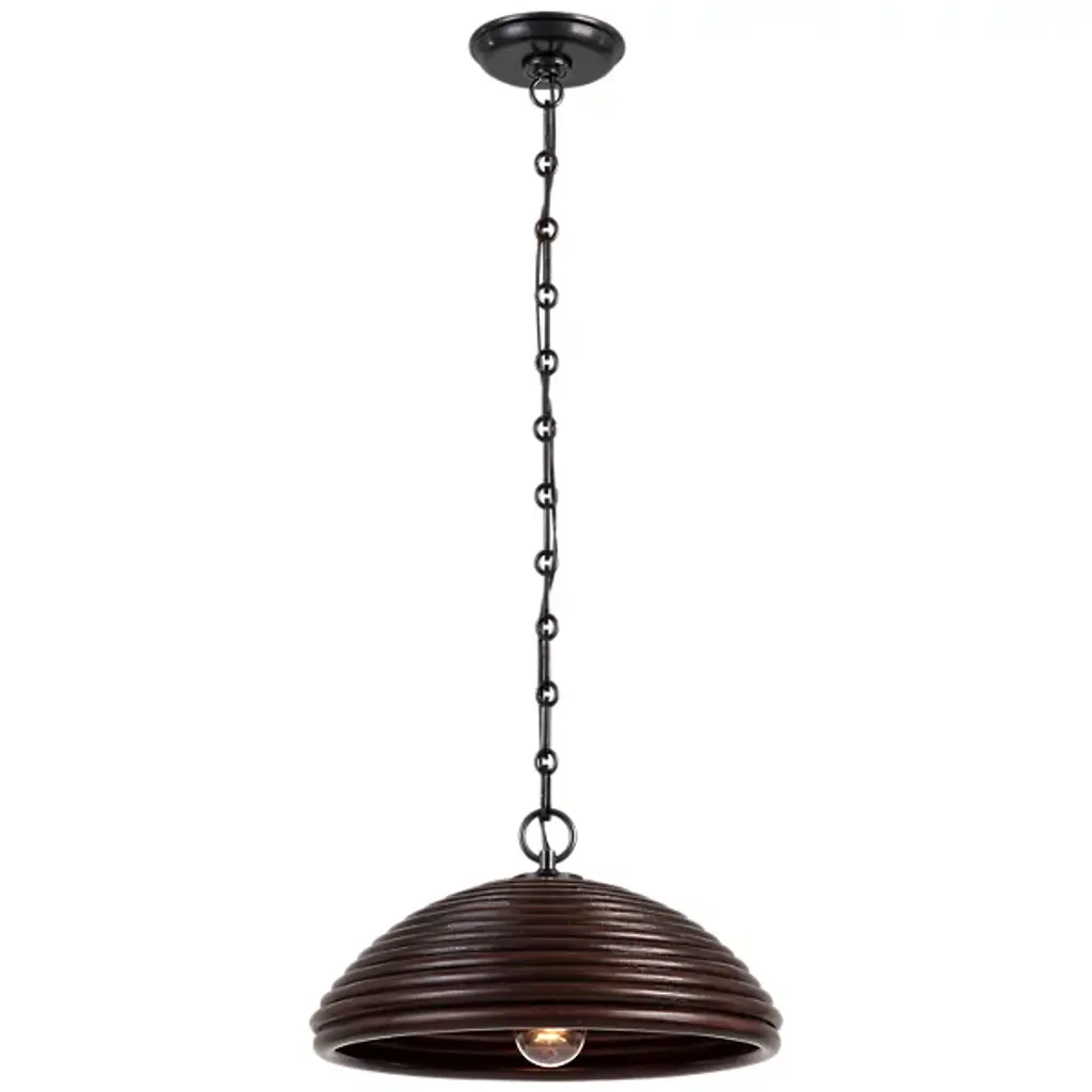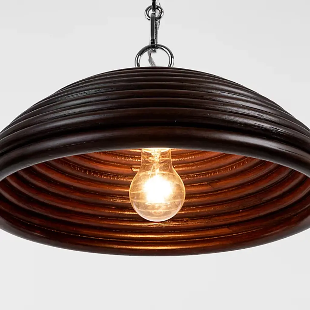 The Emerson Dome Pendant from Visual Comfort Signature takes a wider approach to rattan construction with its extended dome shape. Suzanne Kasler's design places emphasis on the horizontal banding technique, where parallel rattan strips work together to form a solid yet permeable shade. The pendant combines industrial elements through its chain mounting system with natural materials in the shade construction. Brass accents add definition to connection points, while the broader dome shape provides expanded light coverage.