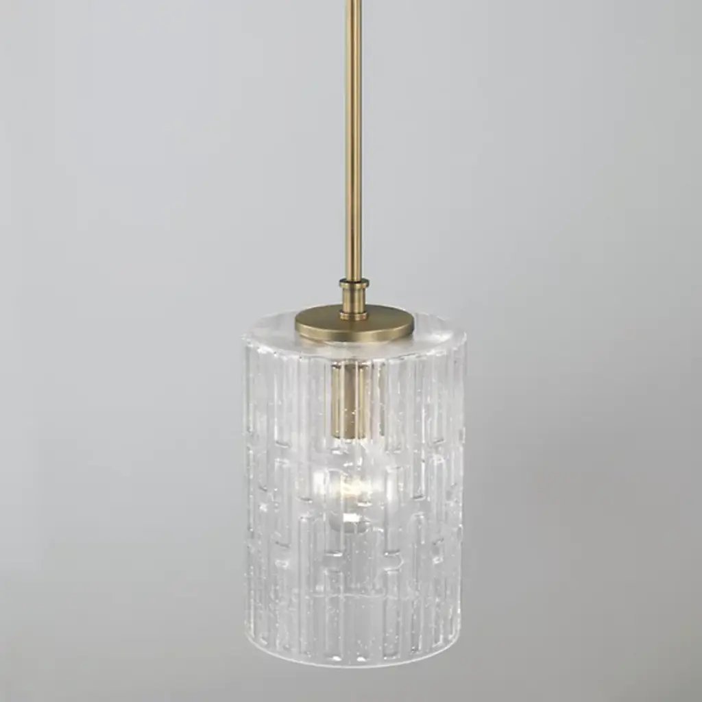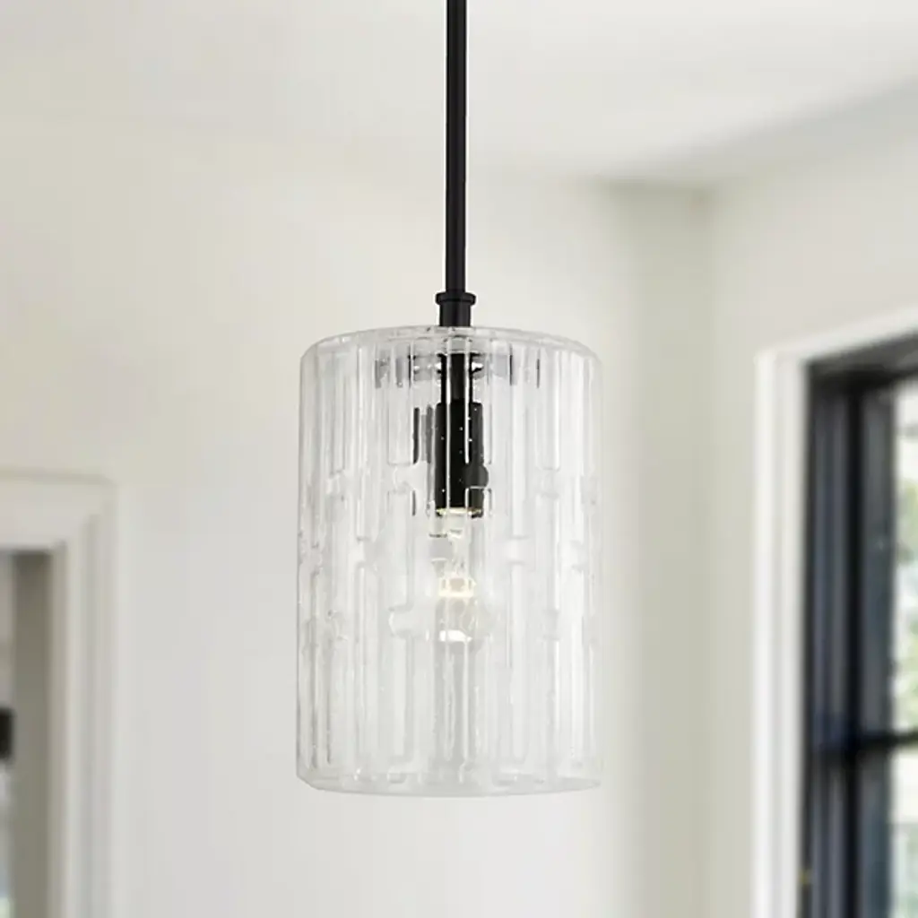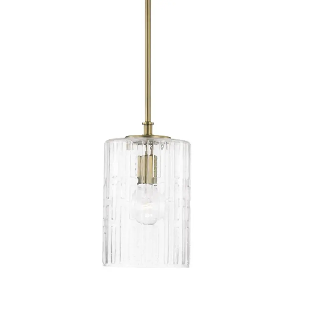 Mesmerizing with detail. A simple silhouette and rich accenting combine to make the Emerson Mini Pendant from Capital Lighting an intriguing and balanced design. It’s a transitional piece for the refined home setting. The pendant welcomes a placement on its own or as part of a series over a table. The metal construction gives it a solid, enduring quality. Hanging below, a glass shade draws your eyes to inspect its seeded details and its embossed geometric pattern. Both accenting elements on the glass tone down the brilliance of the bulb inside. When turned on, the pendant creates an ambient light and a soft down glow.