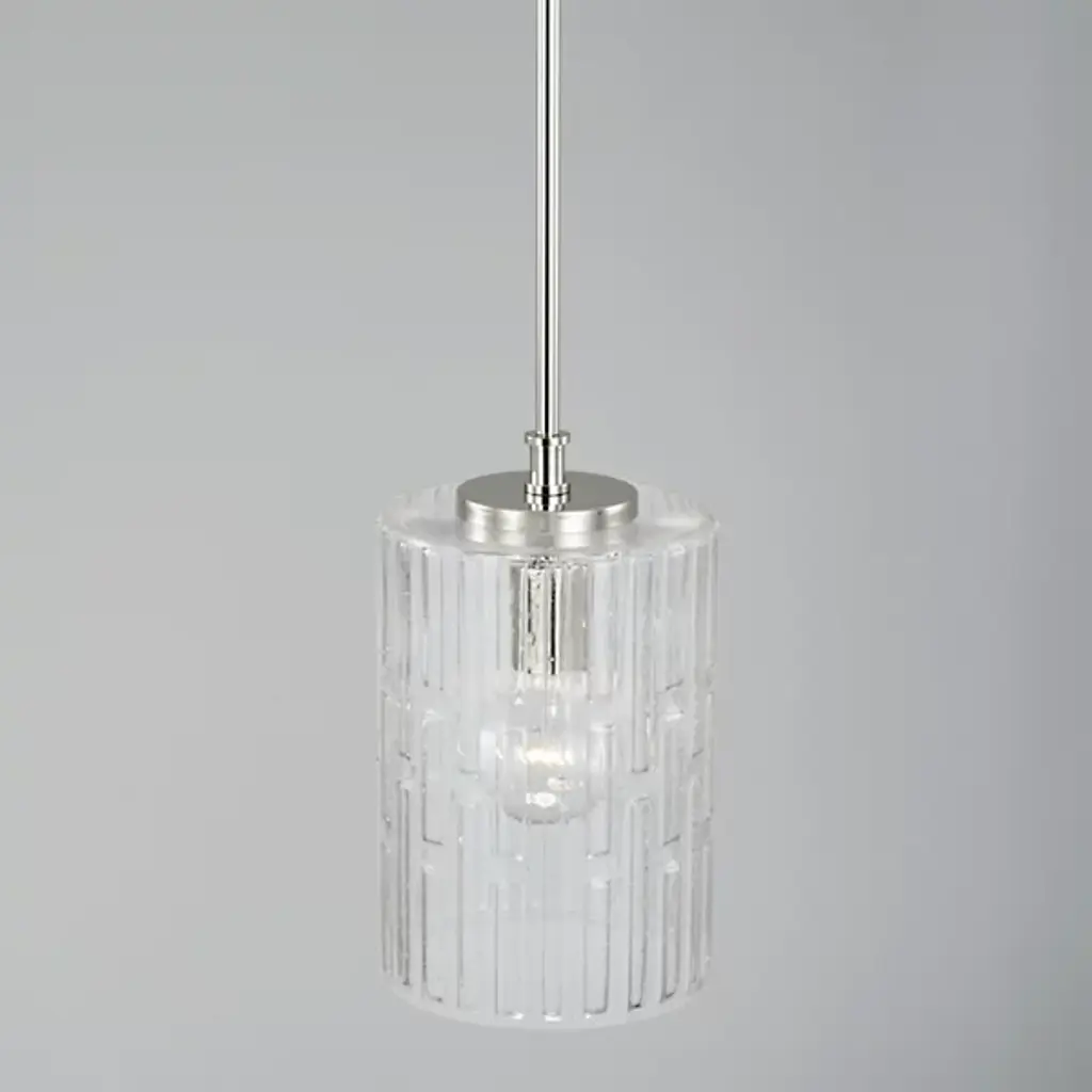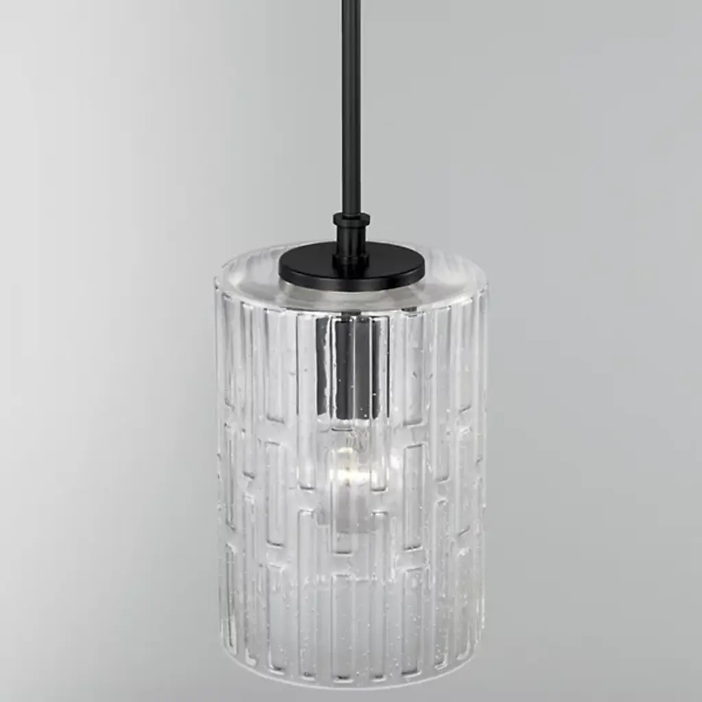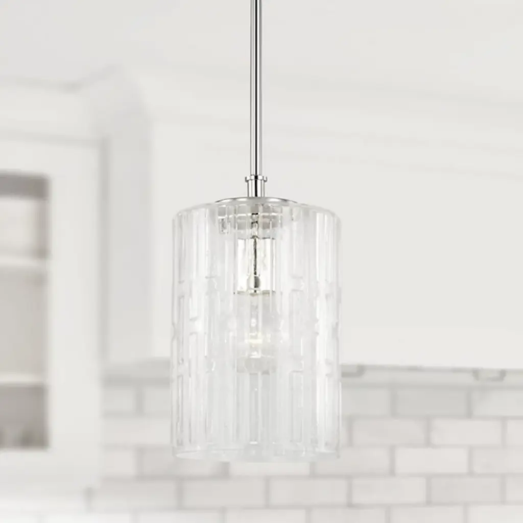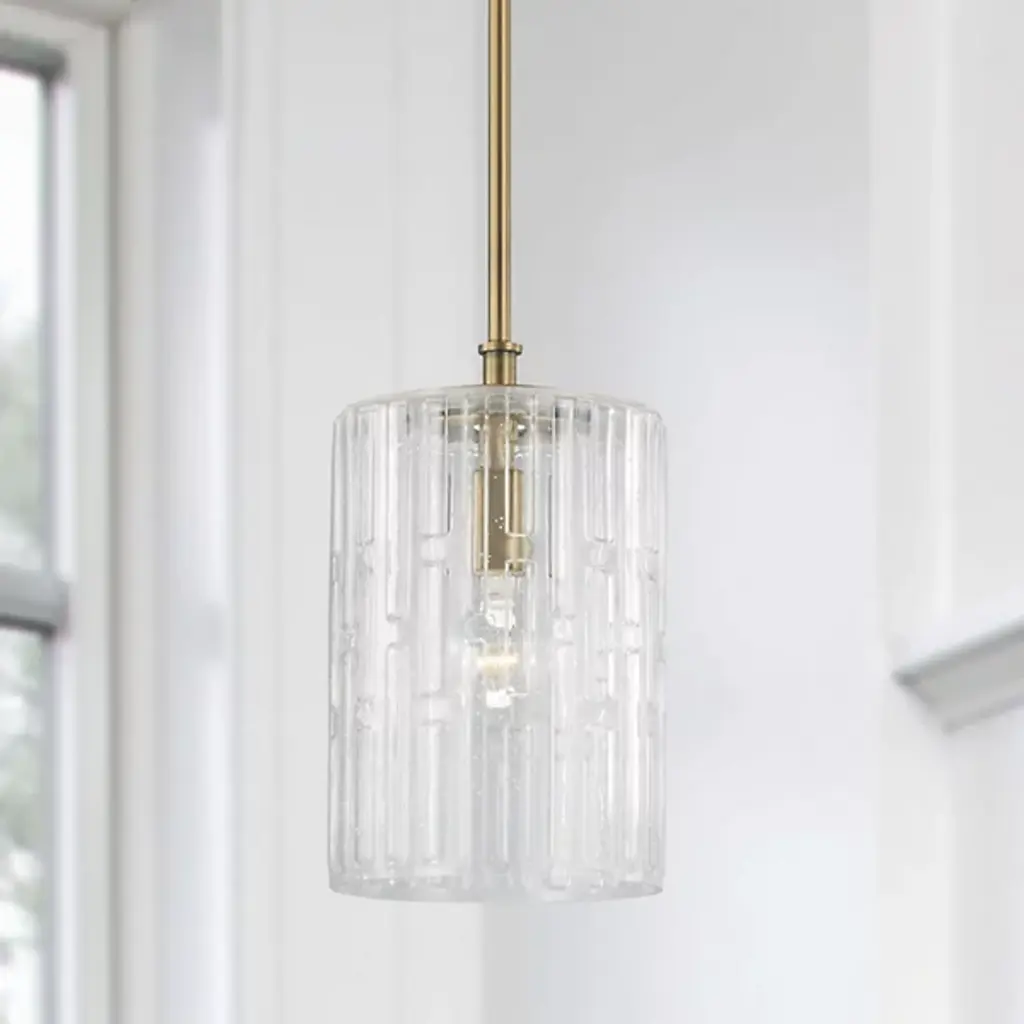 Mesmerizing with detail. A simple silhouette and rich accenting combine to make the Emerson Mini Pendant from Capital Lighting an intriguing and balanced design. It’s a transitional piece for the refined home setting. The pendant welcomes a placement on its own or as part of a series over a table. The metal construction gives it a solid, enduring quality. Hanging below, a glass shade draws your eyes to inspect its seeded details and its embossed geometric pattern. Both accenting elements on the glass tone down the brilliance of the bulb inside. When turned on, the pendant creates an ambient light and a soft down glow.