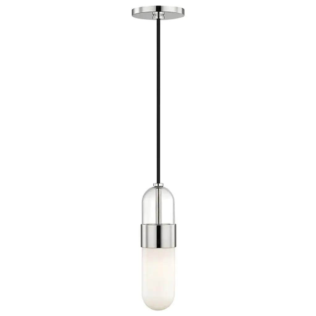Update your decorative lighting with the Emilia Mini Pendant by Mitzi. This fixture features a unique capsule design with a Clear Glass top and Opal Glass bottom. At the center, a polished Metal band accent divides the pendant. Add a trio of pendants to illuminate a kitchen island or hang a pair for bedside lighting.