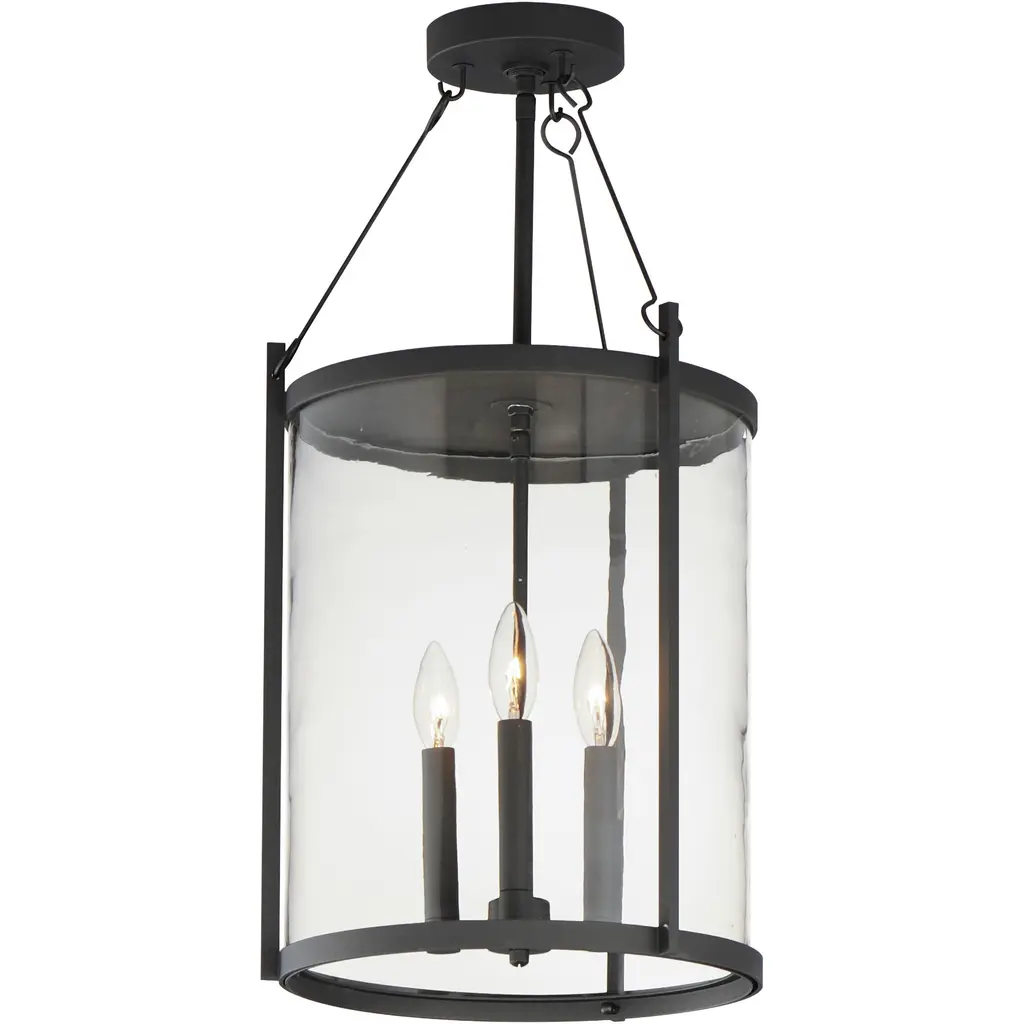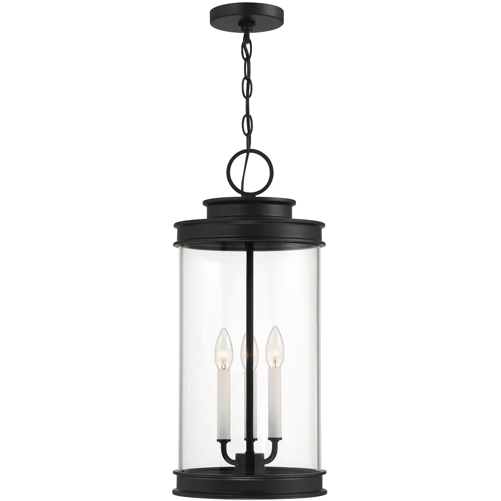 Classic lantern style gets a fresh new look in the Savoy House Englewood 3-light outdoor hanging light. A beautiful cylinder of clear glass is held in a minimally detailed frame finished in timeless Matte Black. White candle covers create a perfect pairing with the finish. Englewood is 23.5" in height and 10.5" in width. Uses three candelabra size bulbs of up to 40 watts per bulb. Bulbs not included. Damp area rated.