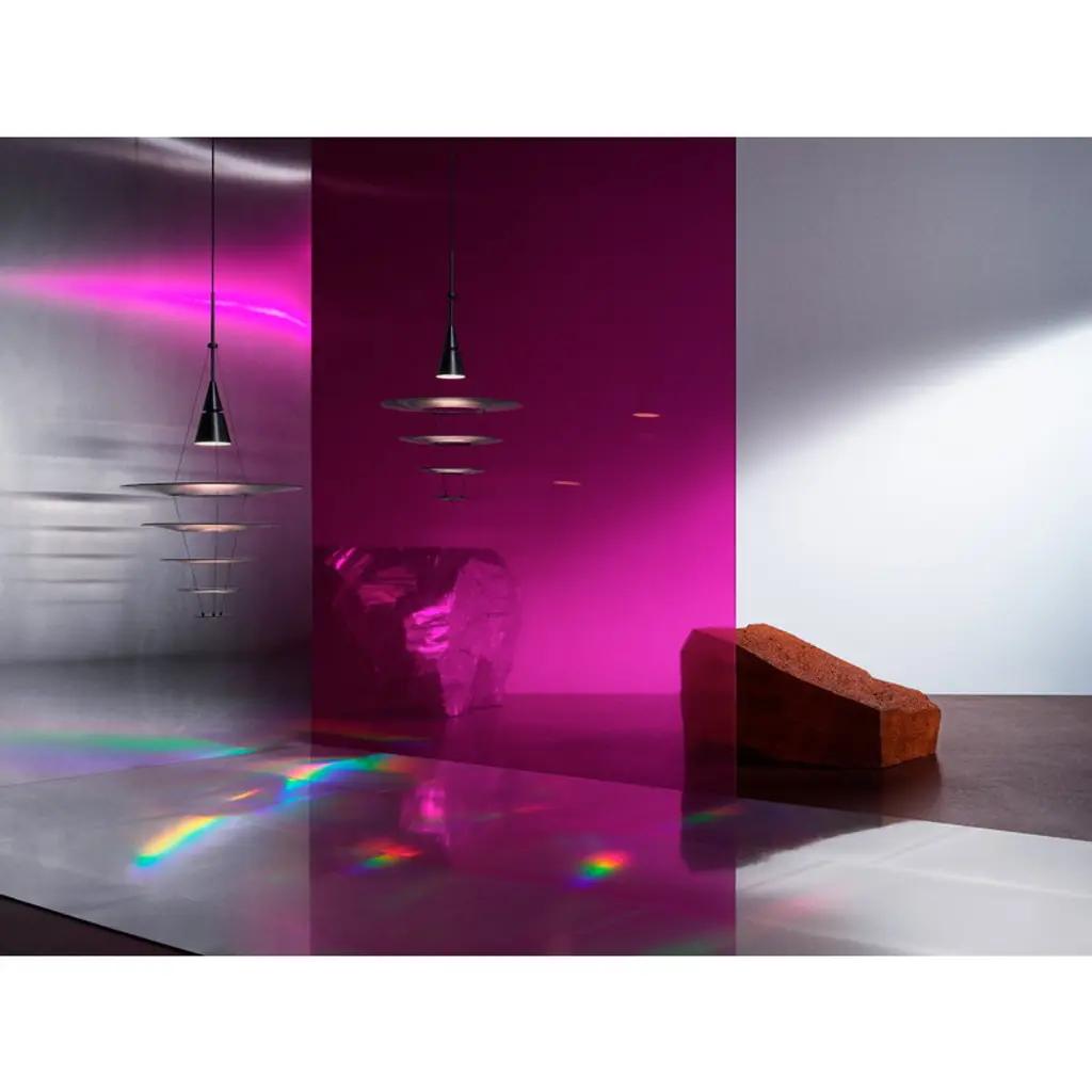 Louis Poulsen’s Enigma 425 pendant lamp, designed by Shoichi Uchiyama from Tokyo, has a distinctive, sculptural structure and a height of 29.13 x 0 in (74 x cm. cm). Enigma consists of thin acrylic shades that seem to be floating above each other. The result is an elegant play of light that creates an interesting, three-dimensional impression. A bold combination of Japanese and Scandinavian design, Enigma fits well with Louis Poulsen’s philosophy by combining direct and indirect light into pleasant general lighting.