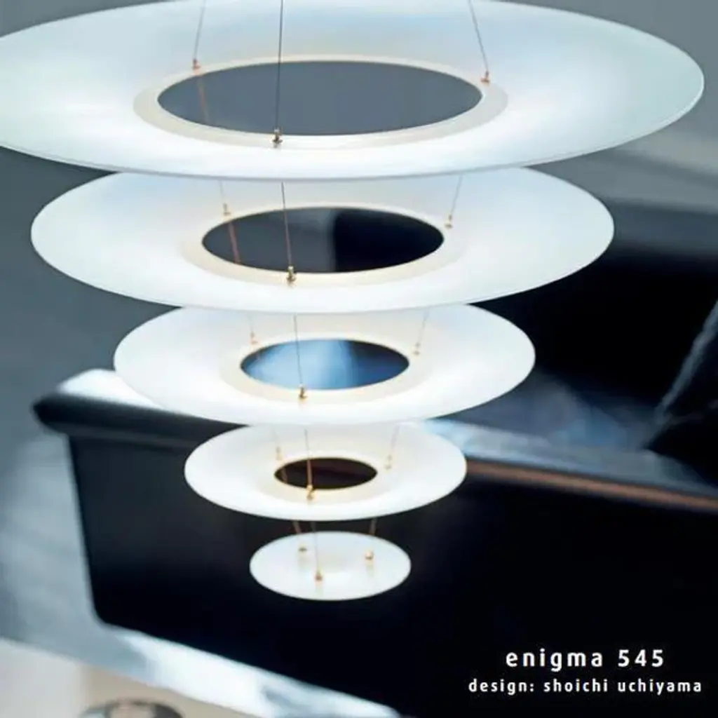 The Enigma pendant was born as a result of the pursuit of high-quality and glare free soft light spreading to the whole space. The four shades will be lit up and emerge into the space. Looking up at the pendant from the bottom, a sequence of the four shades will create a gradation and produce a beautiful harmony. It emits glare-free lighting to large rooms via its innovative yet simplistic form. The strong direct light from the halogen lamp hits each shade, is reflected and diffused with precision allowing a soft transmitted light spreading downward. This expression of transmitting light through the shades has never been found in other lighting fixtures. Download Enigma 425 Pendant Lamp Brochure