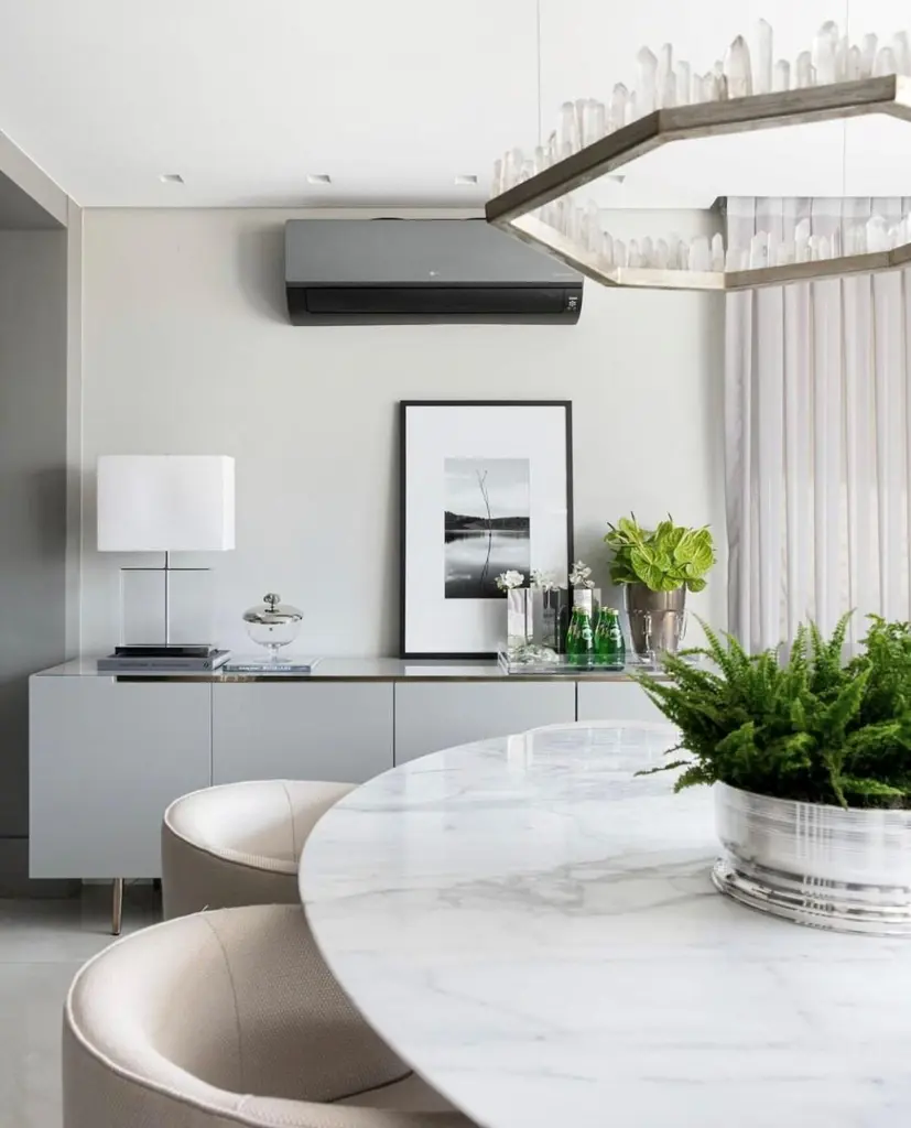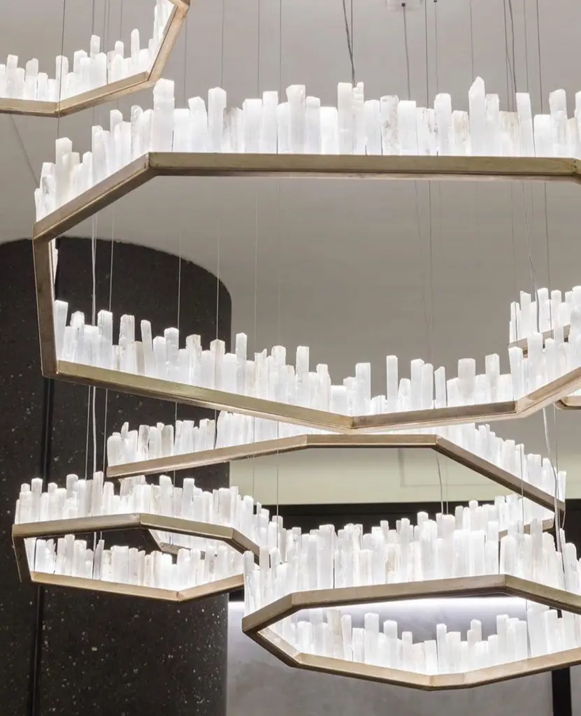 Ensemble of 7 white quartz pendant lamp by Aver Dimensions: 81 x 81 x 18 cm.Lighting: One LED 28W / 1800 Lumens.Finish: Silver leaf, old silver leaf, gold leaf, old gold leaf, copper leaf, rusty, pink gold, brass.Rock crystal: Quartz.