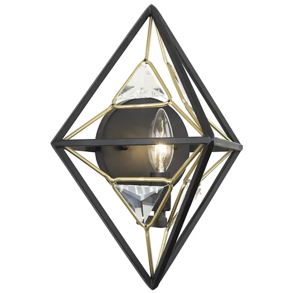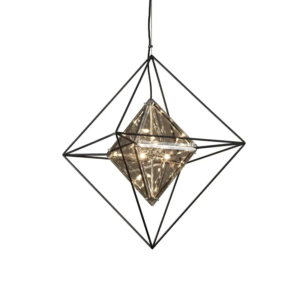 Lights are sprinkled throughout the interior of Epic’s diamond-shaped, plated topaz prism, producing a dazzling effect. When turned on, the glass diffuses the glare, and when turned off, the plated quality of the glass creates a subtle yet stunning appeal. Finished in Forged Iron, the exterior hand-worked iron frame creates a simple silhouette, accented by Polished Chrome details. Epic’s been given a new look with this more transparent, glam version. Features