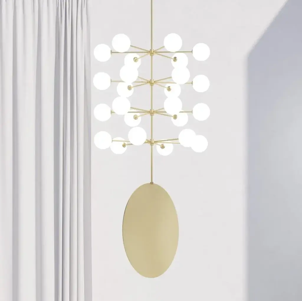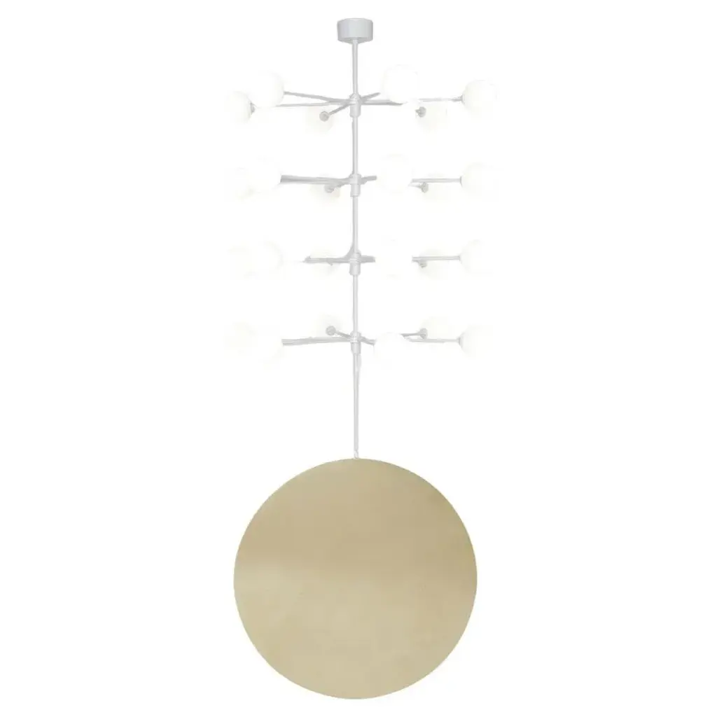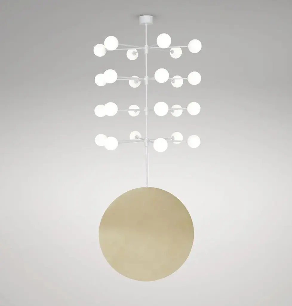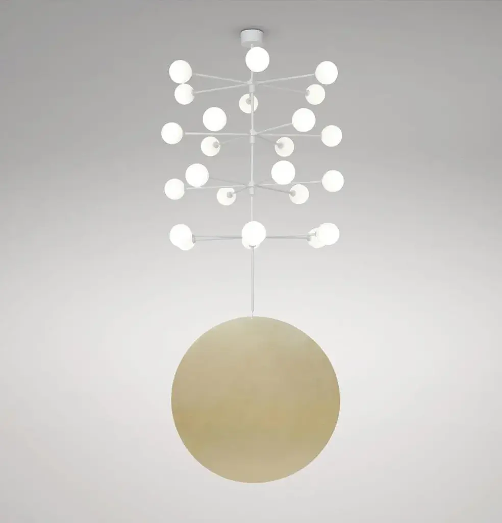 Epic three 4 rows pendant light by atelier areti dimensions: d 68 x w 68 x h 190 cm. Materials: powder-coated metal, brushed brass, white glass. up to 250v (europe/uk standard).