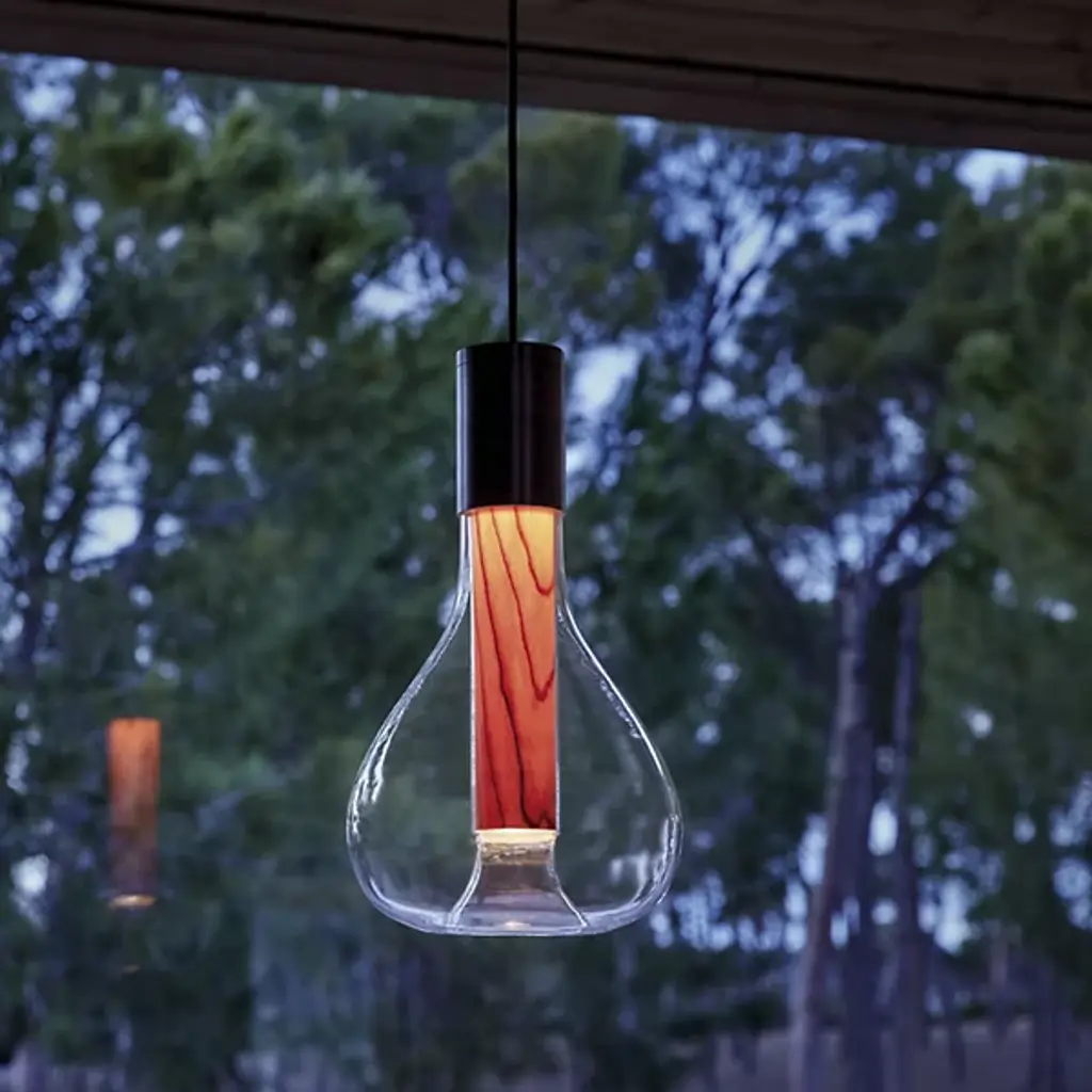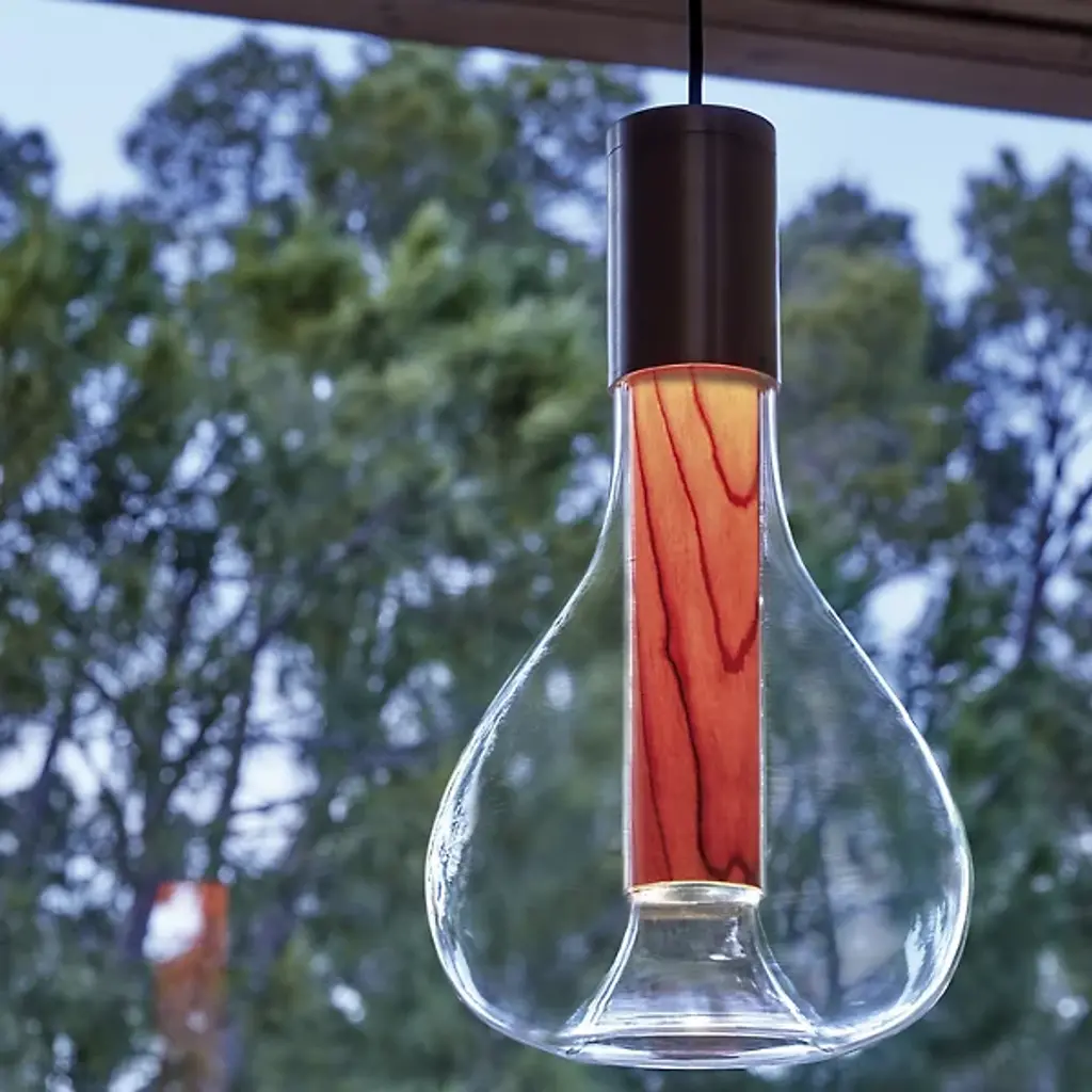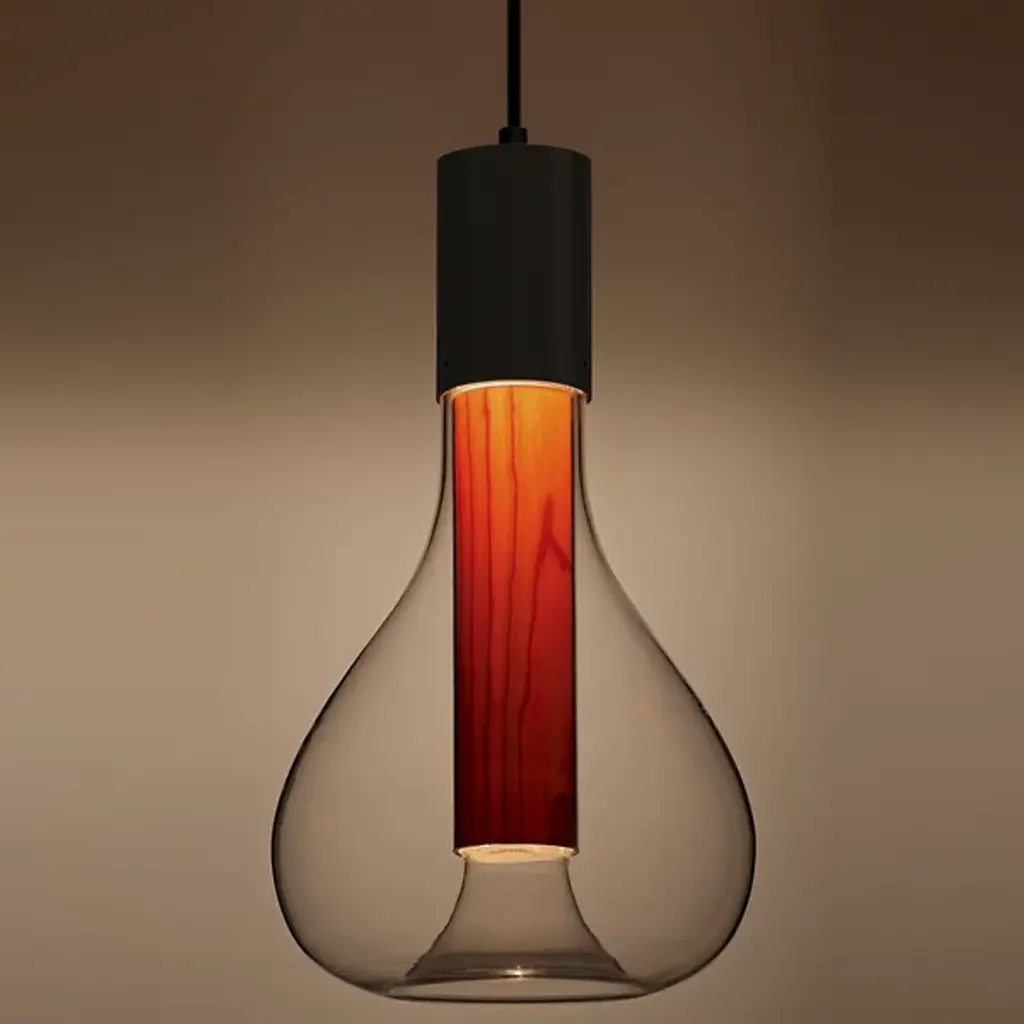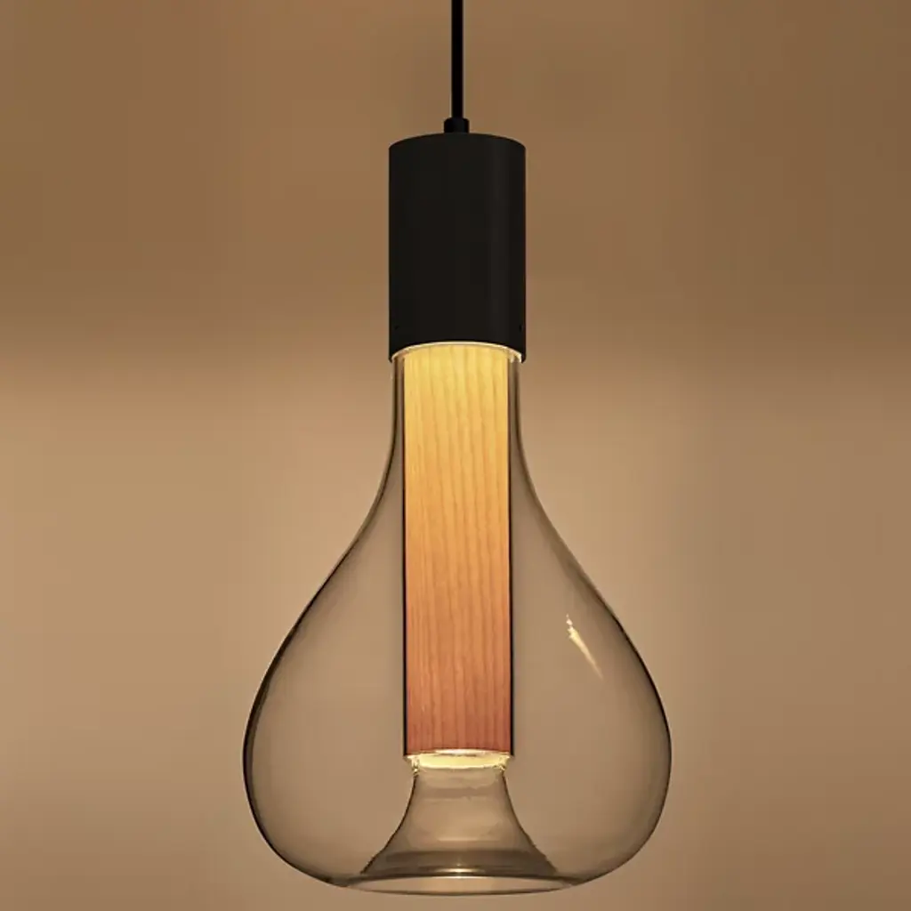 Add that perfect touch of ambiance to your favorite space with the Eris Mini Pendant from LZF. Designed by Mayice Studio in 2020, this beautiful modern piece exemplifies the use of mixed materials with an elegant and engaging silhouette. Smooth metal makes up the brief cylindrical lamp base as it hangs from a single delicate cord. Wood veneer replaces the metal, extending deep into a bulbous clear glass shade that encloses around it. An integrated LED within the base shines an atmospheric glow that adds depth and ambiance to the space.