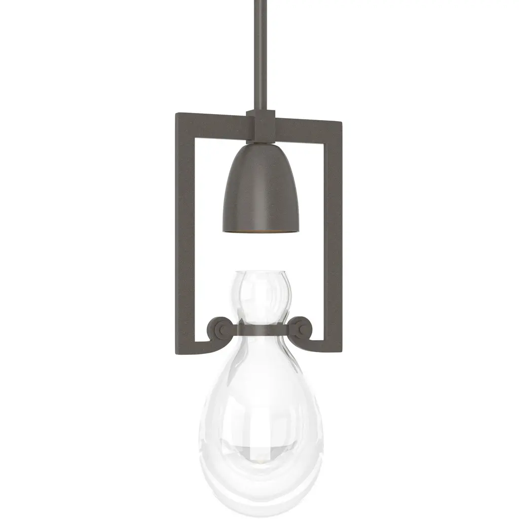 Inspired by the flat-bottomed Erlenmeyer flask, this pendant's blown-glass flask is encircled by a handcrafted steel collar fixed to an arch within an arch. The light's angle can be adjusted with the steel cog locked by a hand-wrought nail.