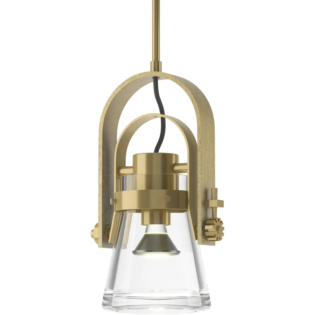 Inspired by the flat-bottomed Erlenmeyer flask, this pendant's blown-glass flask is encircled by a handcrafted steel collar fixed to an arch within an arch. The light's angle can be adjusted with the steel cog locked by a hand-wrought nail.