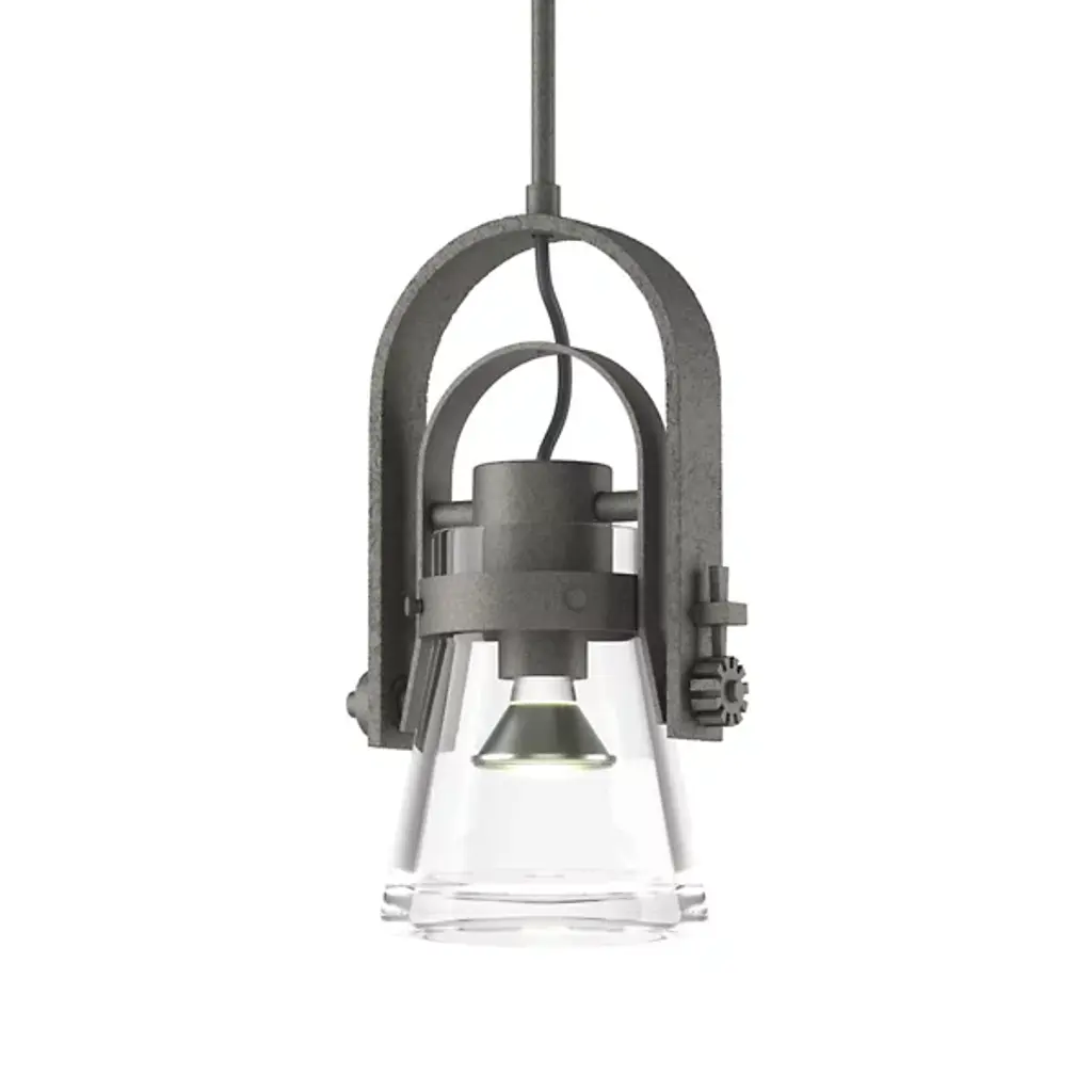 Inspired by the flat-bottomed Erlenmeyer flask, this pendant's blown-glass flask is encircled by a handcrafted steel collar fixed to an arch within an arch. The light's angle can be adjusted with the steel cog locked by a hand-wrought nail.