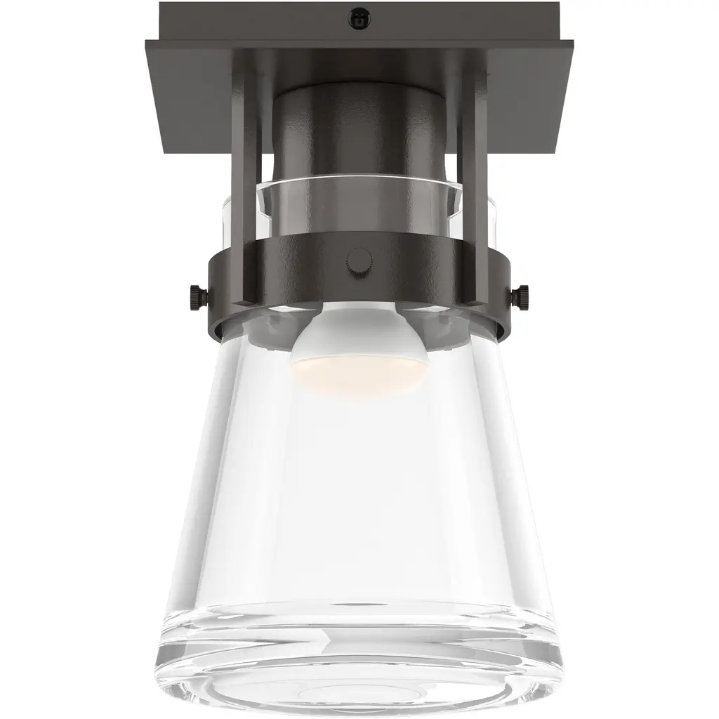 Named after the Erlenmeyer flask used in lab settings, the Hubbardton Forge Erlenmeyer Semi-Flushmount resembles a beaker surrounded by metal hardware. Hosted by a square canopy, four small bars affix the thick blown glass to the metal hardware, the visible fasteners giving the piece an industrial feel.