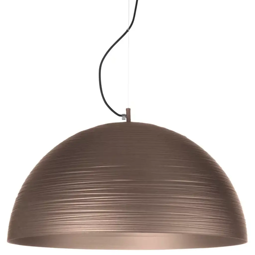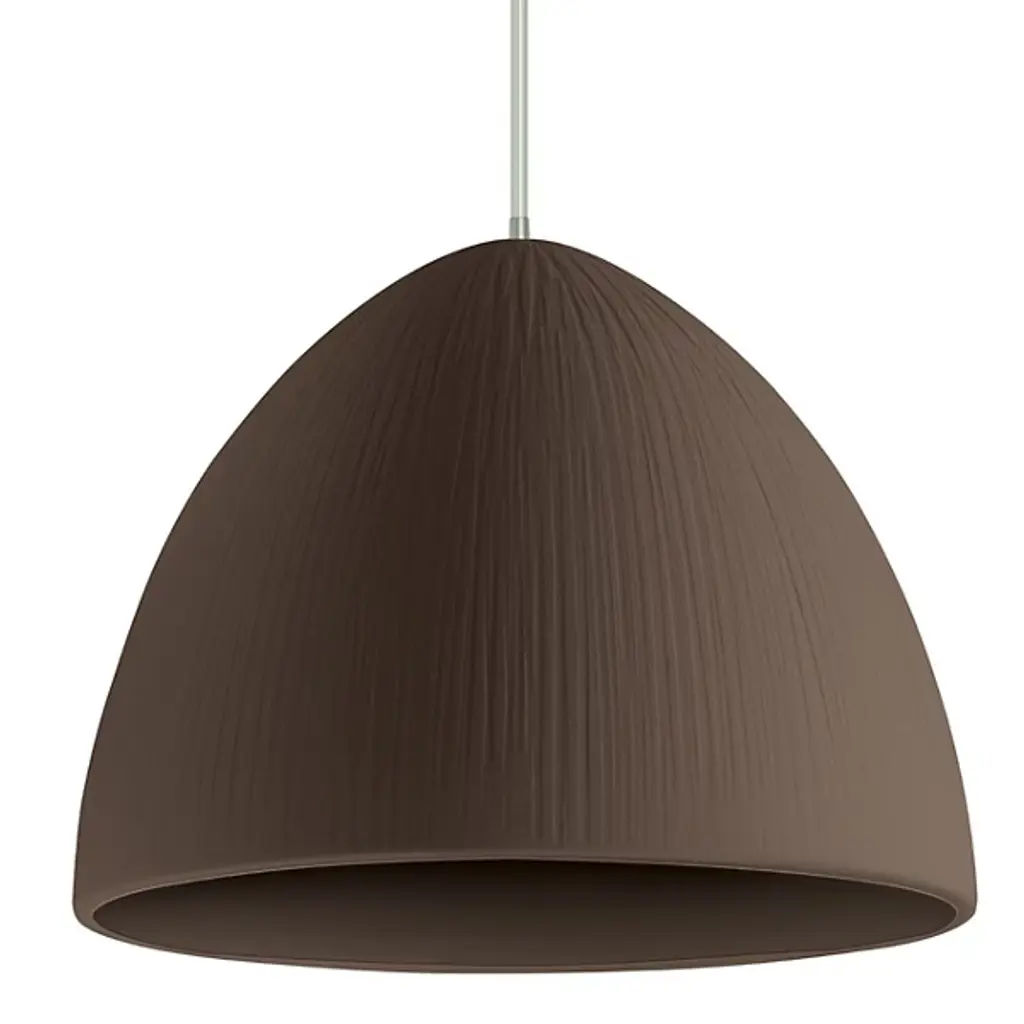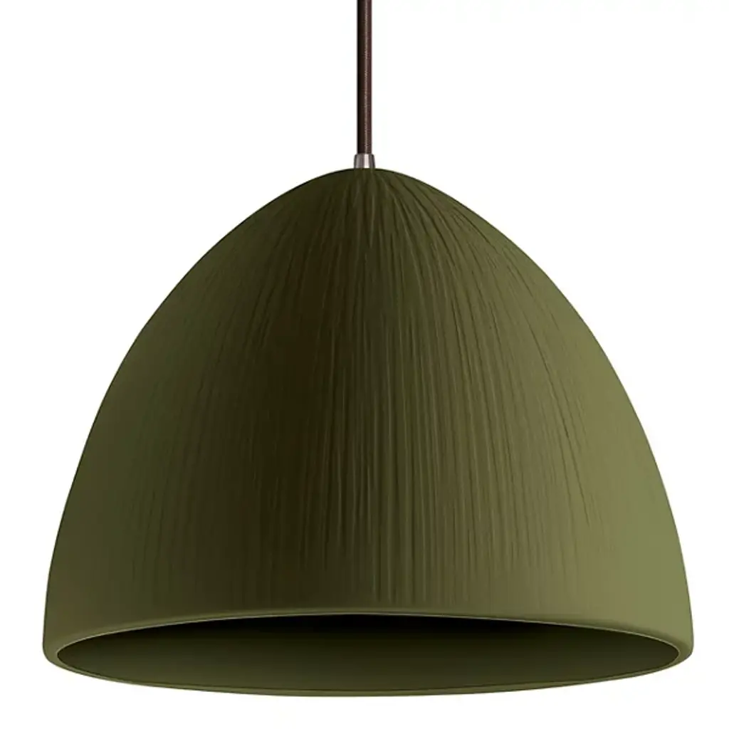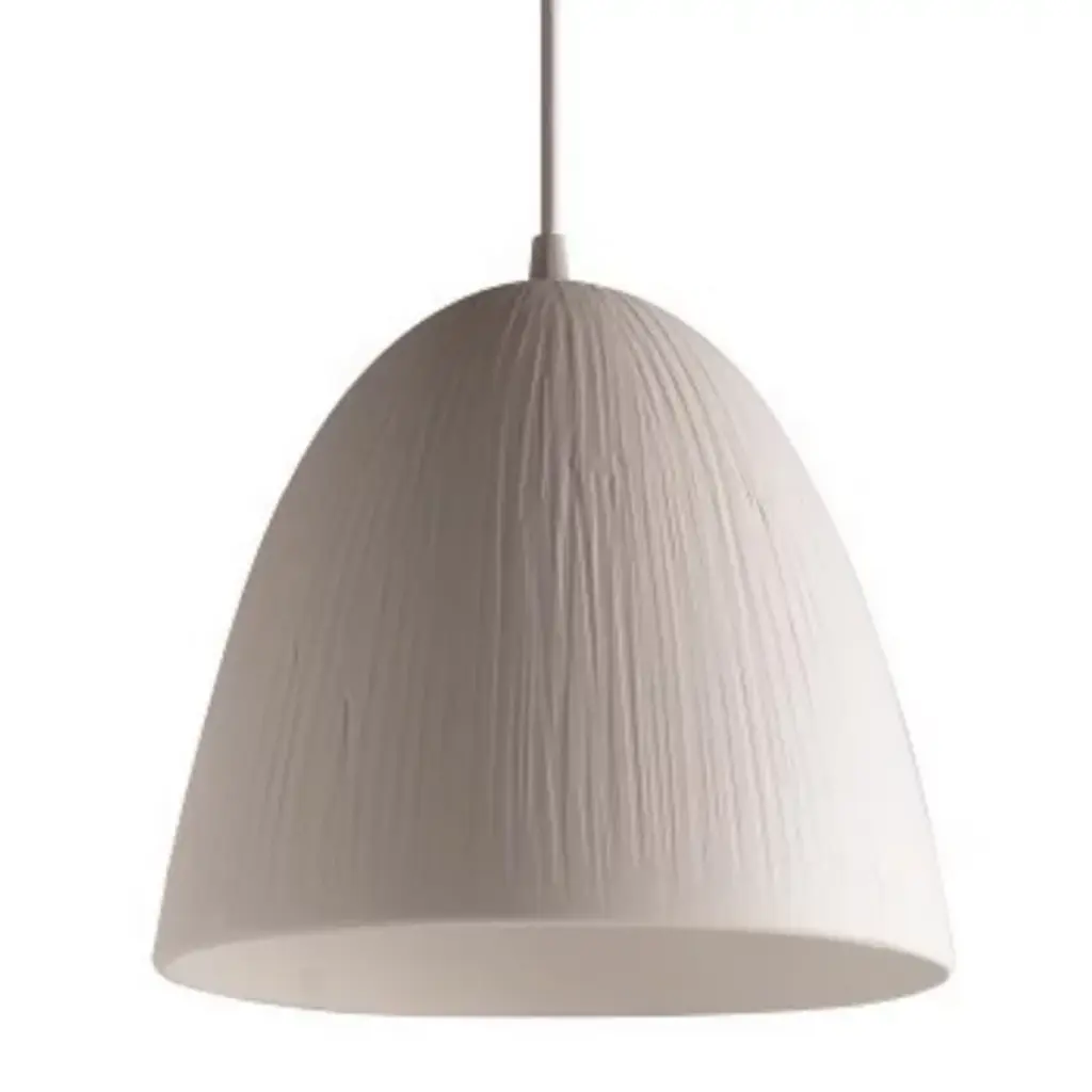 The Eros Pendant from Geo Contemporary presents a bell-shaped design with a textured surface. It has a ribbed exterior, and the gentle curves of the shade flow smoothly from top to bottom, culminating in a wide opening that directs light downward. This pendant hangs from a single cord, allowing for easy adjustment of hanging height. The fixture's understated form makes it suitable for various spaces, from kitchens to living rooms. Its design allows it to be used individually or grouped in clusters for a more dramatic effect.