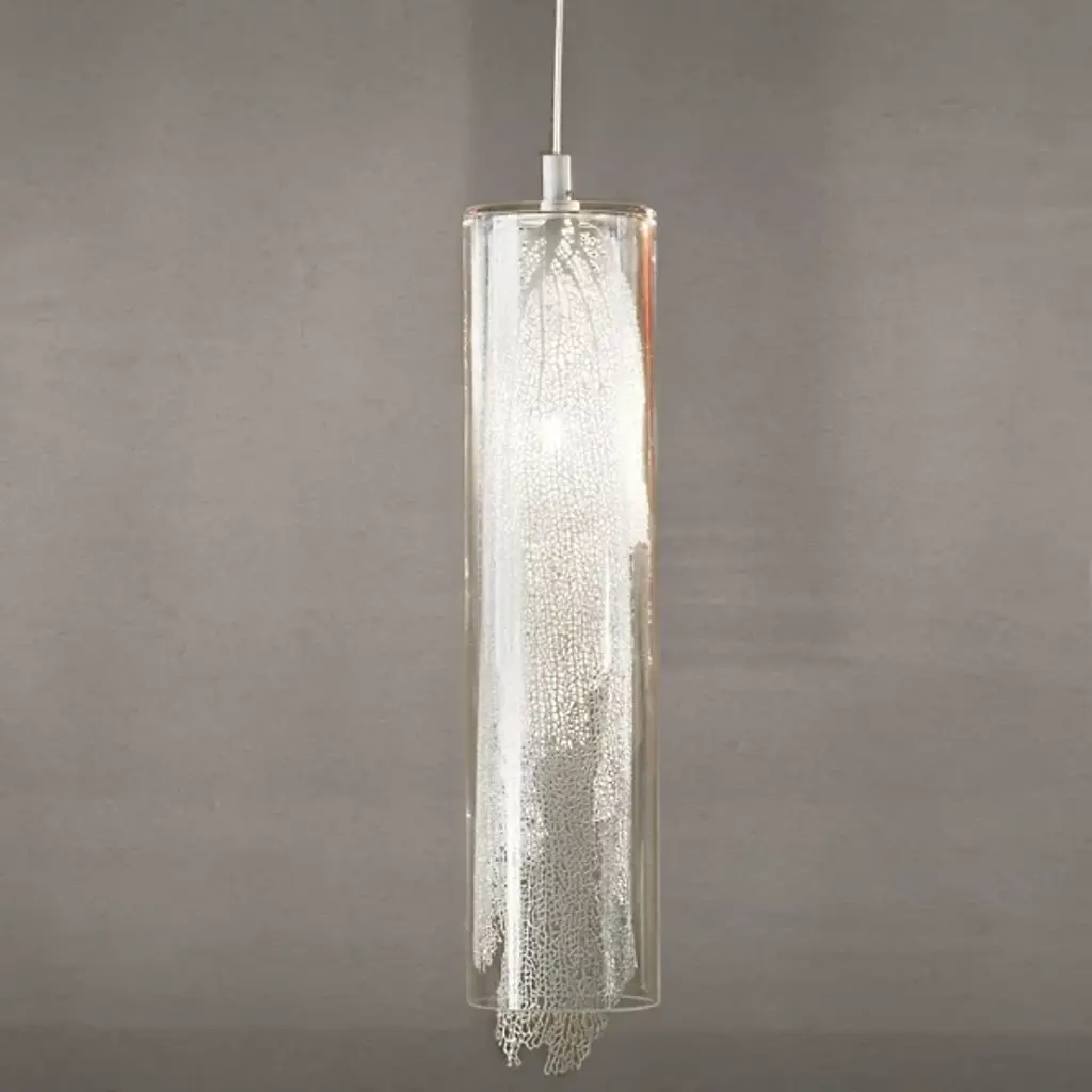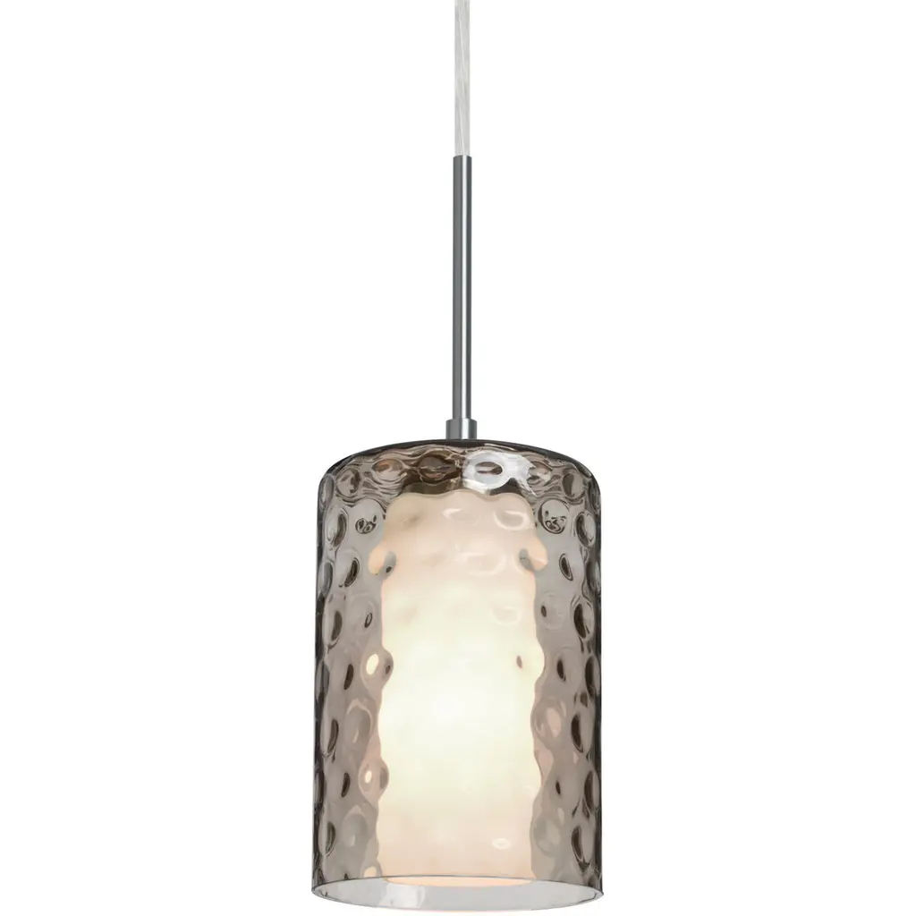 The Esa Smoke Pendant is composed of an outer trans Smoke glass cylinder, with an interesting dimple pattern blown throughout the glass and an inner opal cylinder for concealing the light source. The pleasing play of light through the dimple accents make for an interesting optical affect. The cord pendant fixture is equipped with a 10' SVT cordset and an low profile flat monopoint canopy. These stylish and functional luminaries are offered in a beautiful brushed Bronze finish.
