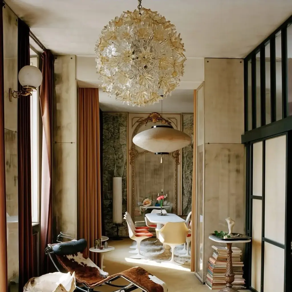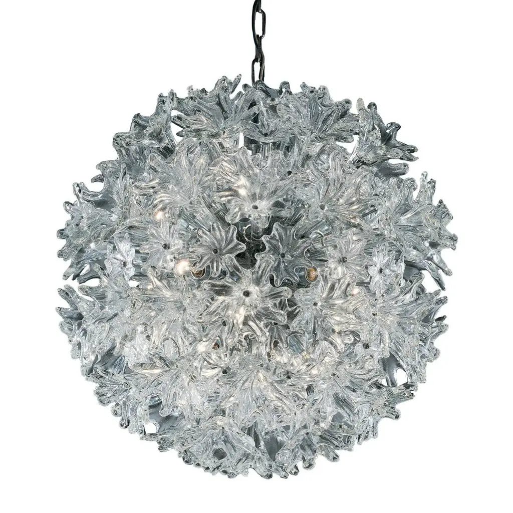 Elevate your space with the exquisite Esprit Pendant Light from Venini. Handcrafted from crystal and amber colored glass, this timeless piece features flower-shaped modules inspired by the beauty of nature. Originally designed in 1960 by Toni Zuccheri, it exudes a sophisticated, art-deco allure, perfect for making a statement in a dining room, kitchen, or lavish living space. Highlights