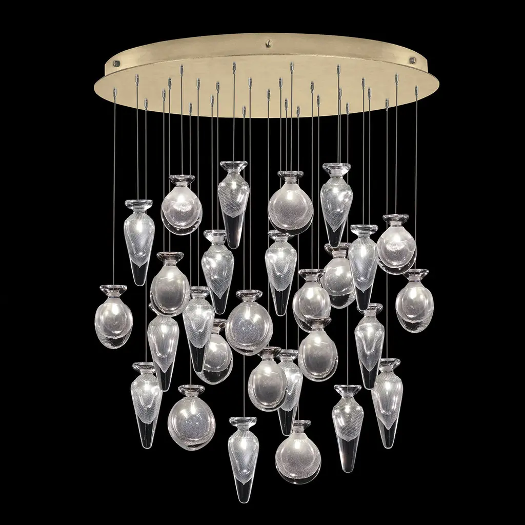 Adjustable pendant inspired from the timeless beauty of vintage scent bottles. Our skilled glass artists have masterfully captured the essence of lightning in a bottle, resulting in exquisite hand-blown designs. Available in standard silver leaf or stand