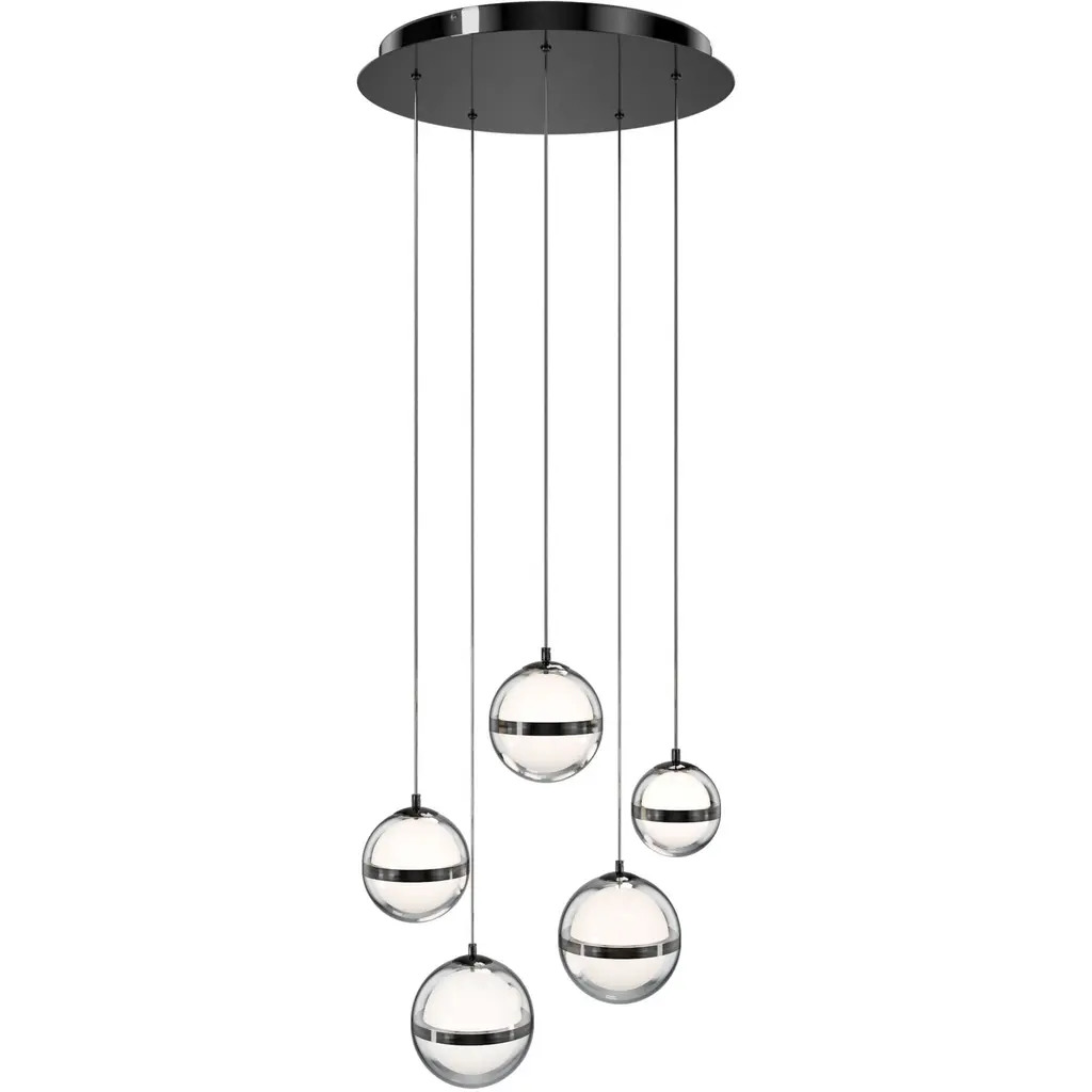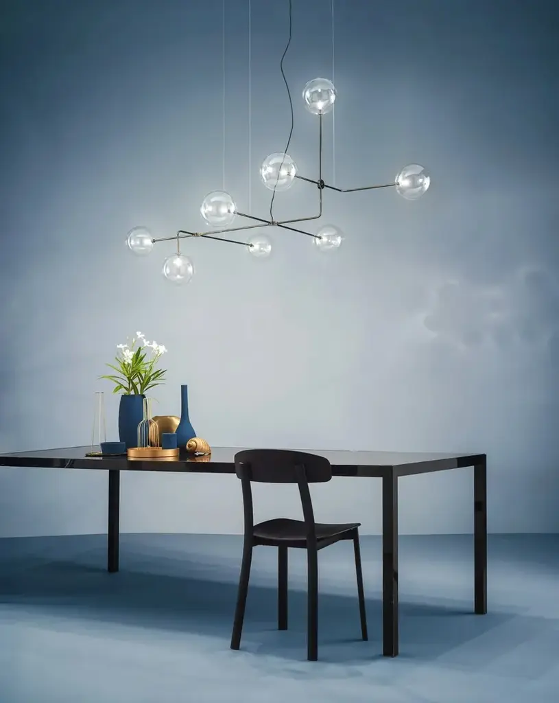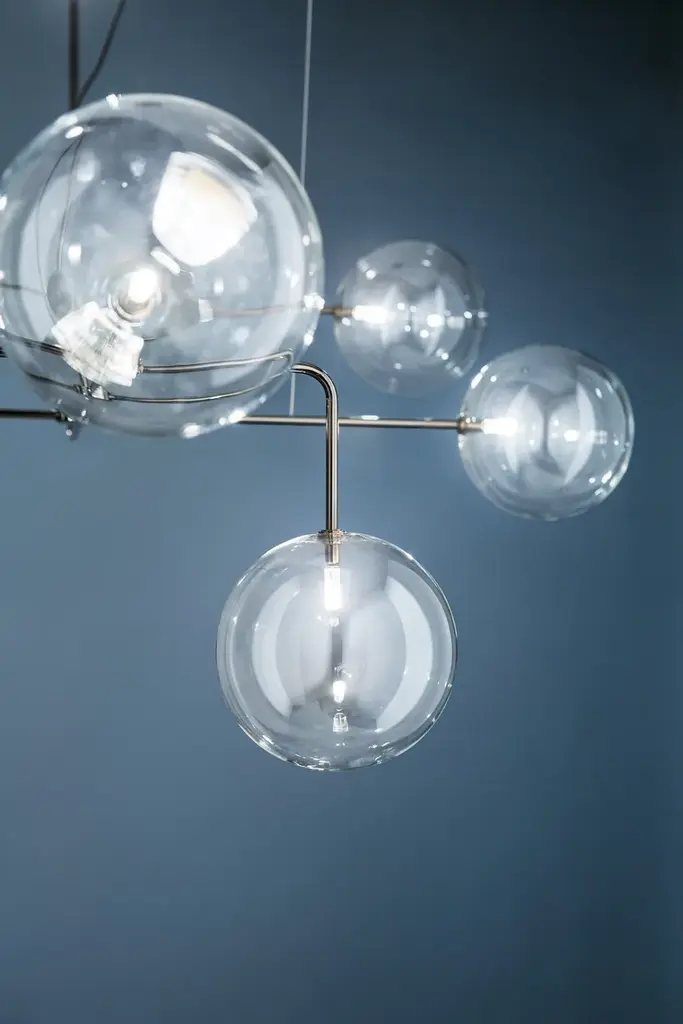 Essenza’s ampoules reflect and amplify the ambient light, creating delicate, undefined, crepuscular lighting effects.Light and shadows are projected outwards according to the rules of refraction, generating horizontal and vertical lines on the surrounding surfaces that describe and represent the orientation of the glass from which they derive.Produced in several versions, this lamp has a simple and contemporary shape that allows it to easily relate to wherever it is installed, whether on or off. 8-lights chandelier with canopy and Spheres in Borosilicate transparent glass. Glossy black chromed metal. 8 x G4 - LED max 2W - 12V -110 Lumen - 3000 KENERGY CLASS FROM A TO G