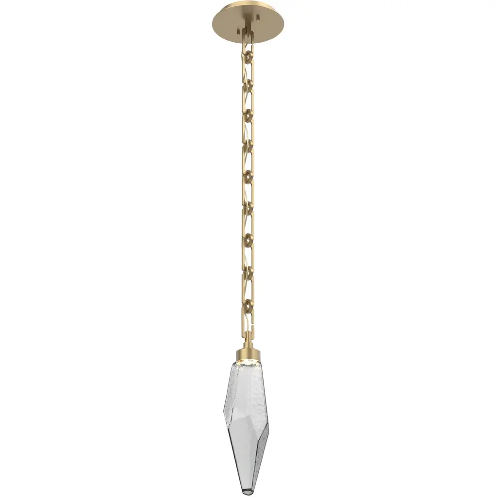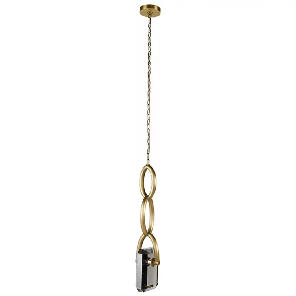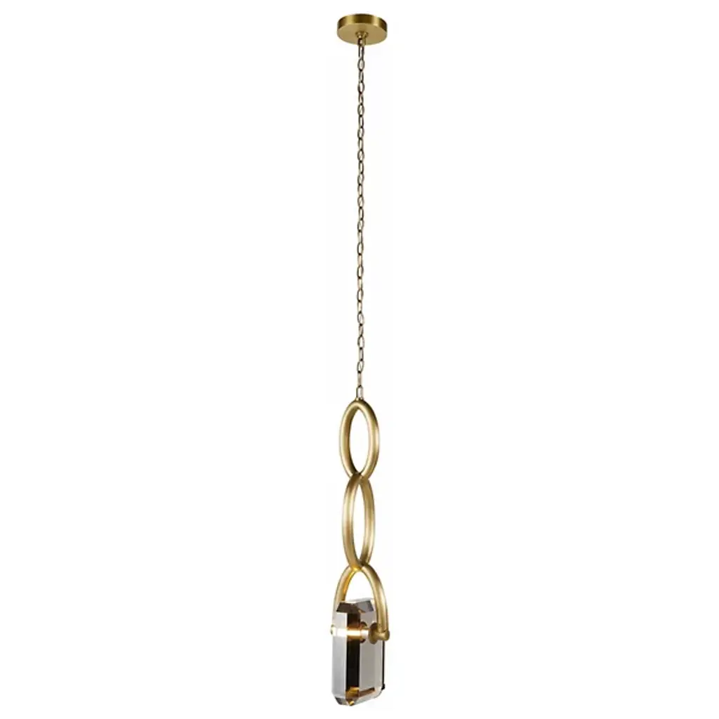 The Estate LED Pendant from Arteriors delights with a luxurious, memorable design descending from a circular canopy. A thick chain of antique brass-finished steel links is suspended from a slim chain above, suggesting jewelry. This sophisticated setting holds a faceted LED-lit “gem” of smoke crystal, creating an impactful, jewelry-like note. The brass-finished iron contrasts nicely with the crystal shade, creating a bold blend of transitional and luxury styles. Damp-listed lamping is fantastic for any indoor space.