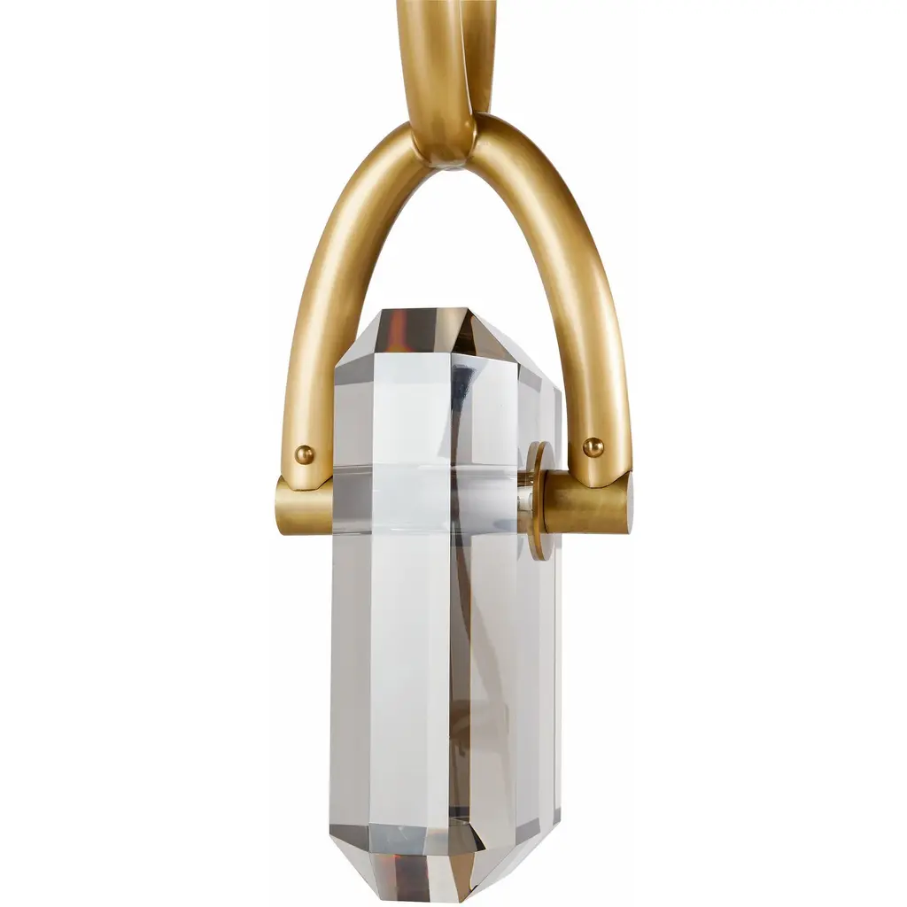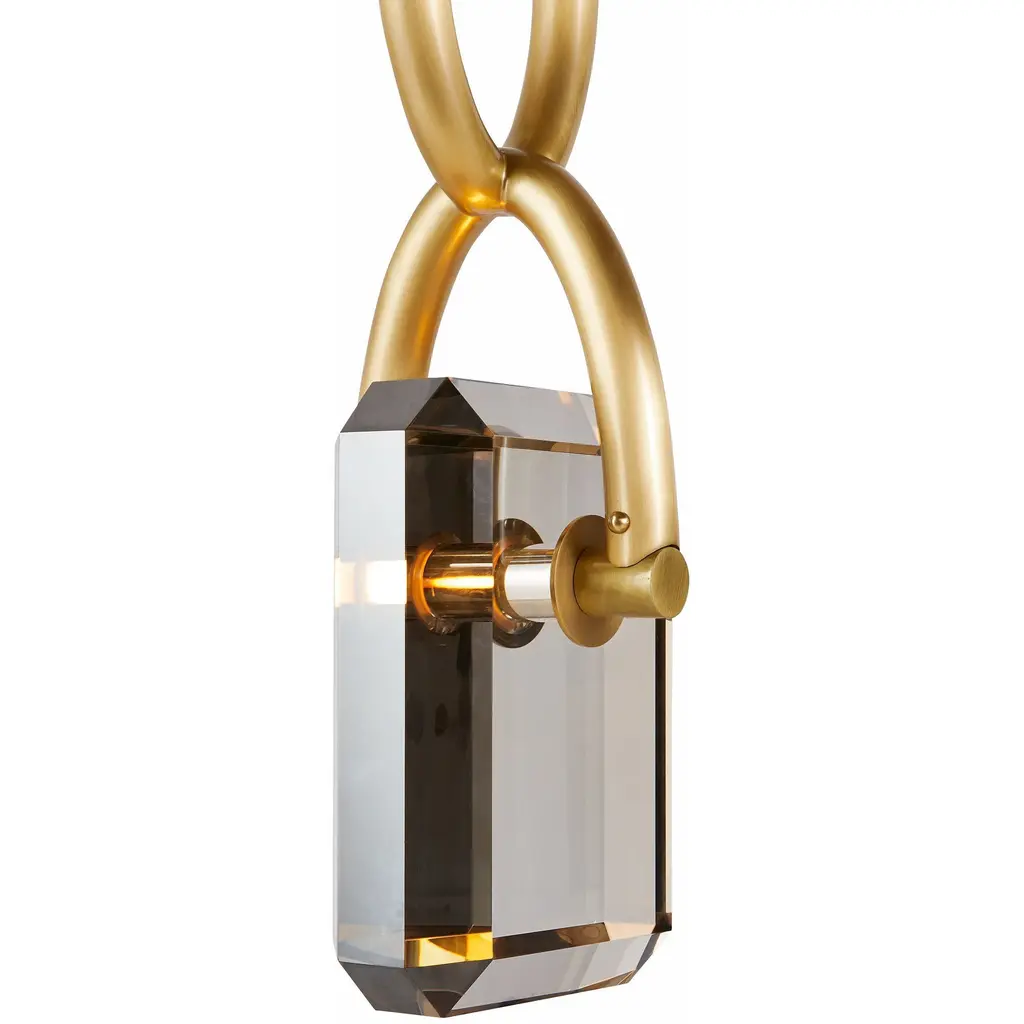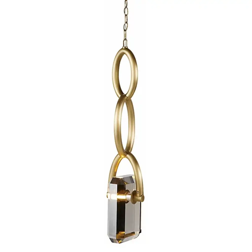 A thick chain of antique brass steel links together to form a stylish setting for our Estate pendant. Designed to hold a faceted LED-lit gem of smoke crystal, this impactful fixture is jewelry for the home.