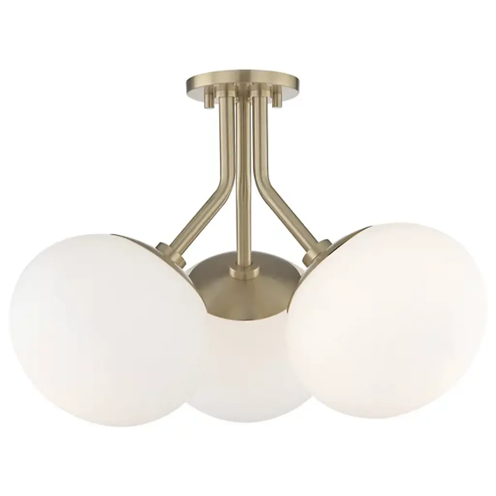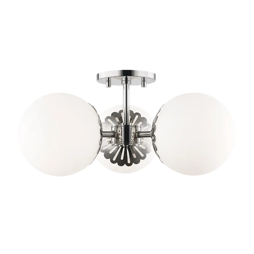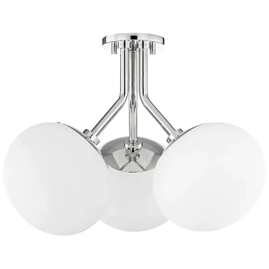 The Estee Semi-Flushmount will light up your world. From a central Metal canopy come 3 outward bending Metal arms, each punctuated with a large Opal Etched Glass shade. Look to this design to enhance a foyer, kitchen, dining room or living room.