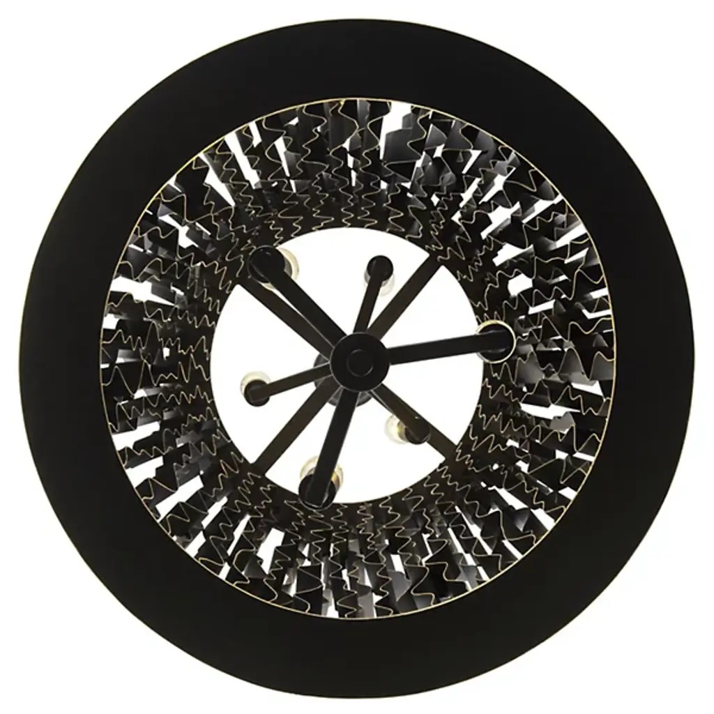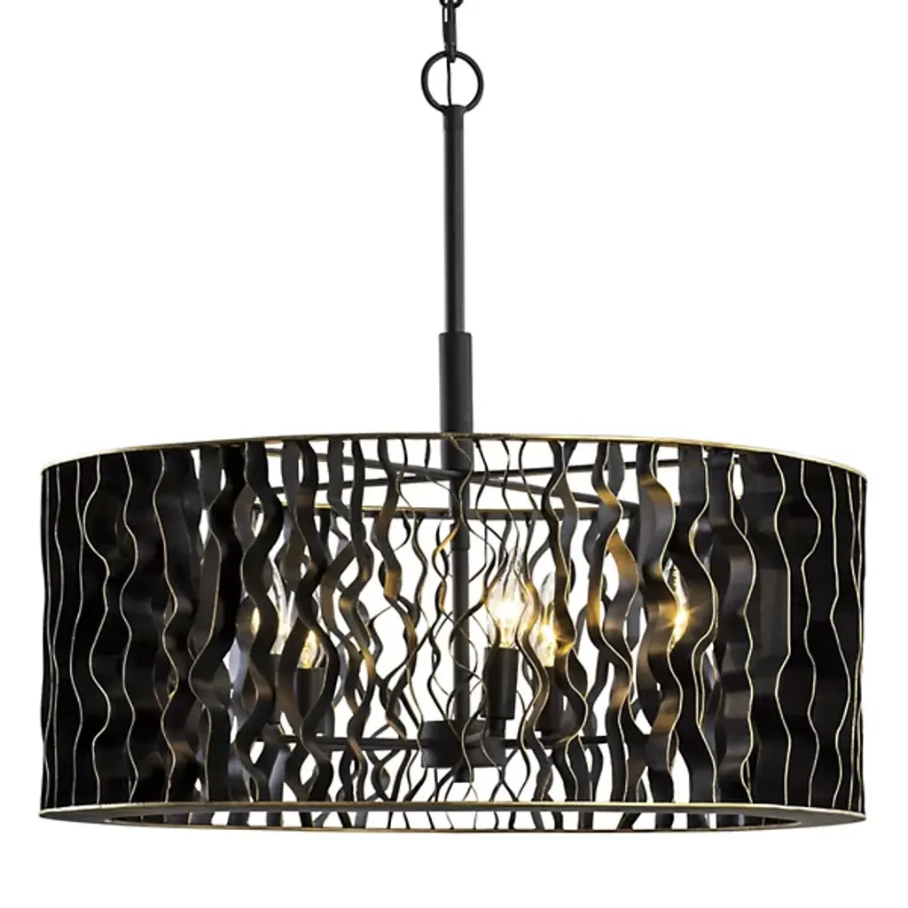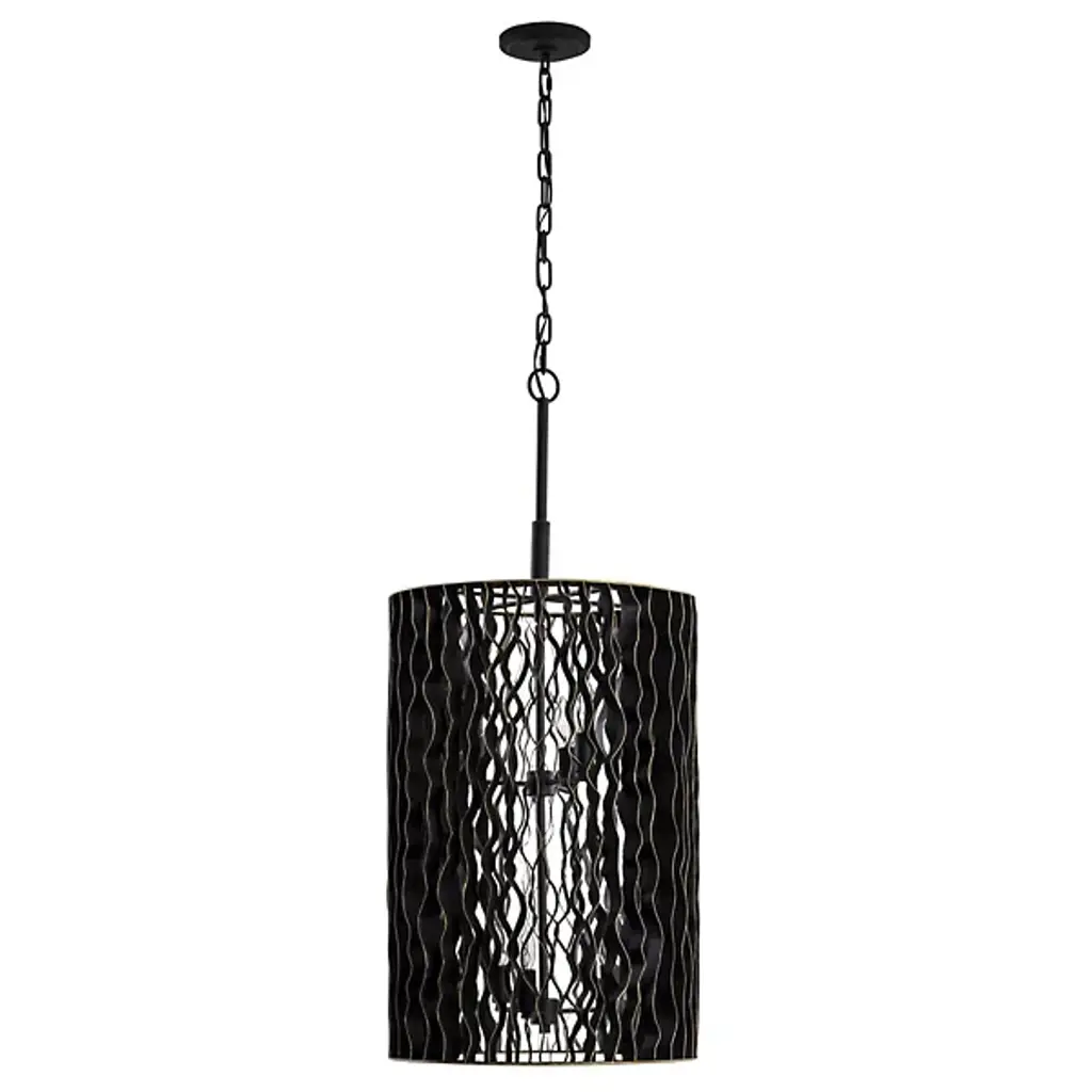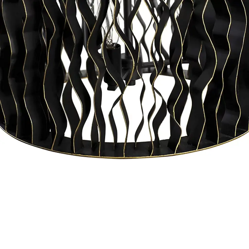 The Estela Tall Pendant from Varaluz invites you on a journey inspired by nature, drawing from designer Ron Henderson's experiences in the Smithsonian Pollinator Garden; the collection reflects the trails explored and the surrounding natural beauty. "Estela" means "trail," and the fixture captures the essence of the many paths converging in this collection. Double recycled wavy steel vanes, finished in black with a subtle gold edging inspired by the Monarch butterfly, create a captivating design, descending around inner lamping transmitted down via a chain, its cascading paths offering visual intrigue.
