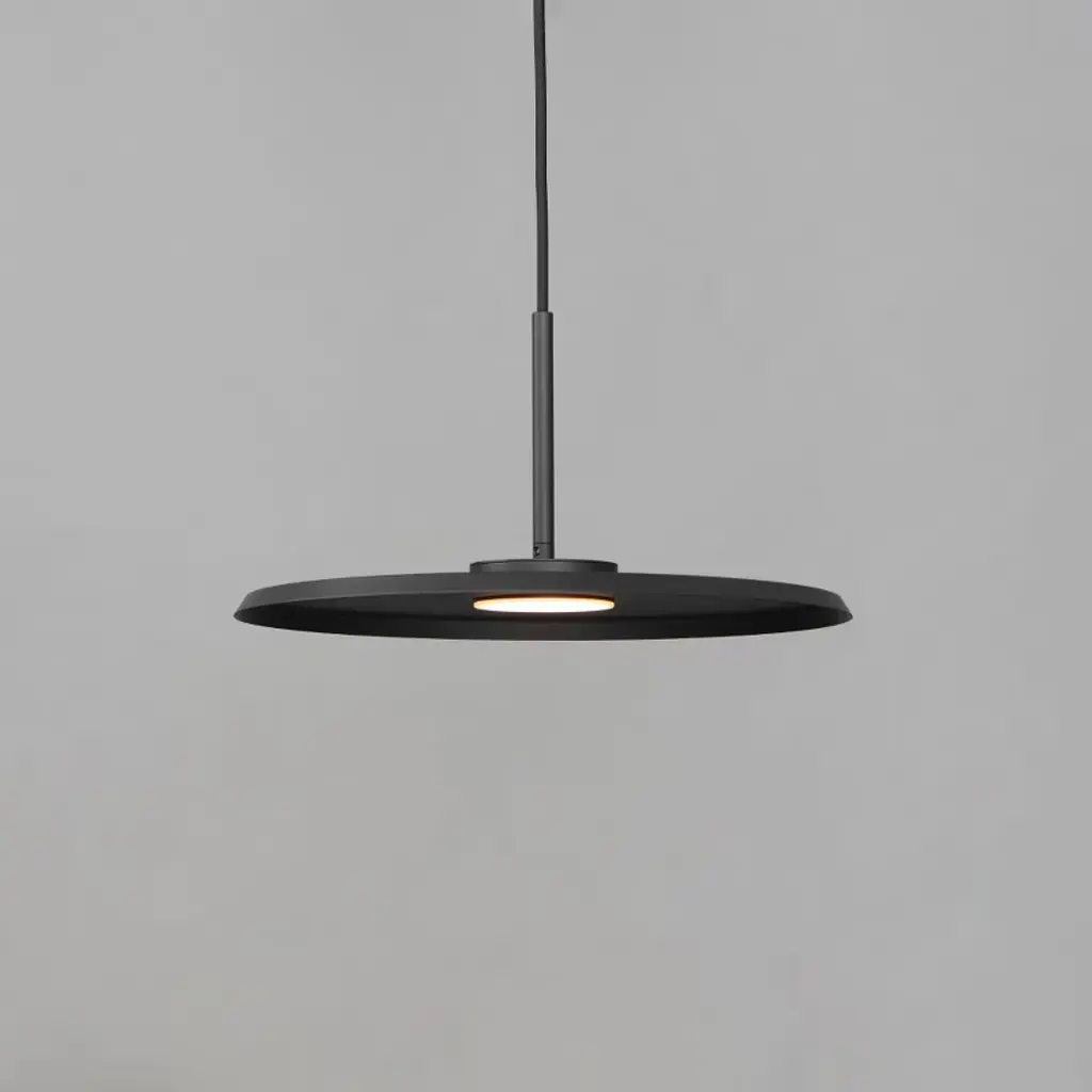 Wide flat discs house LED engines that disappear when viewed at the pendants edge. Supported at their center by thin tubes and black cable, machined aluminum housings feature laterally cut concentric circles drawing inspiration from the grooves in a vinyl record. Finished in your choice of Matte Black, Antique Brass, or Antique Copper, the modern design feels vintage and retro widening the range of compatibility within architectural aesthetics.