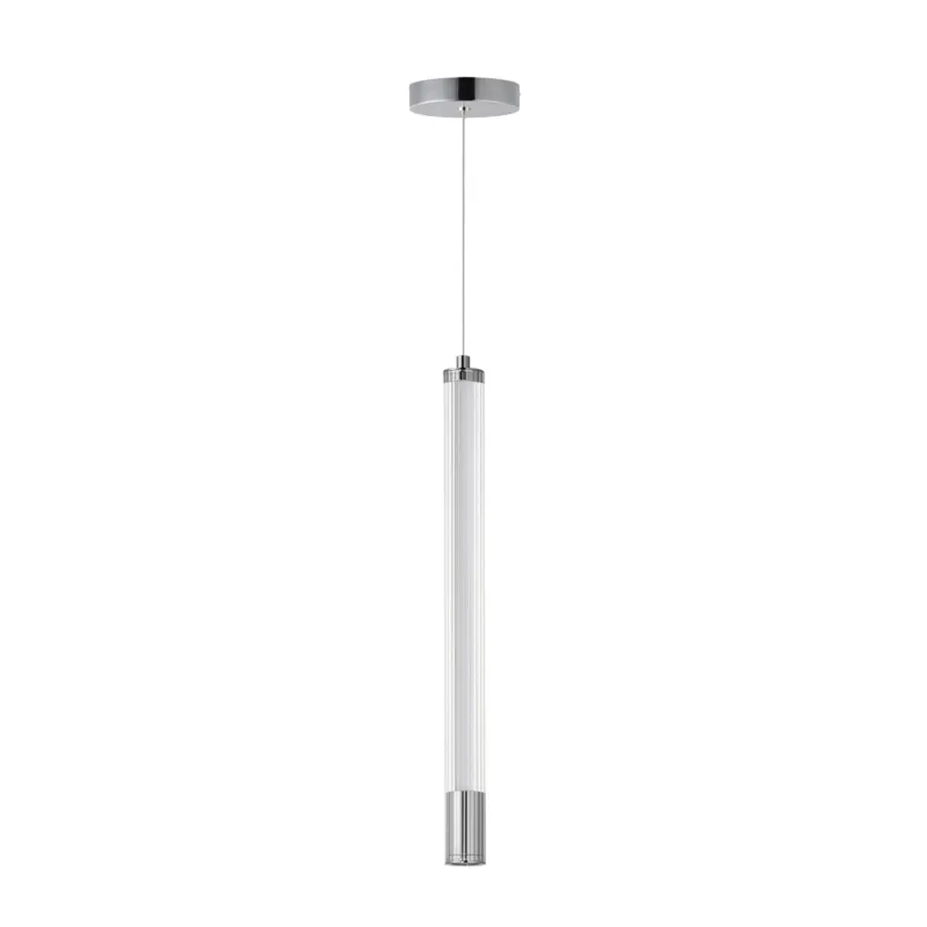 A central, cylinder diffuser of opal white acrylic diffuses LED lighting within a cavity of thin ribbed glass of various lengths. Both imaginative and functional, the bright pendants encase an additional down light recessed within a Polished Chrome, Naturally Aged Brass or Matte Black housing casting light downward. Material: Aluminum, Finish Color: Polished Chrome, Width: 1.5", Height: 14.5", Length: 1.5", Lamping Type: LED, Number Of Bulbs: 1, Wattage: 10 Watts, Cri: 90, Color Temperature: 3000 Kelvin, Lumens: 600, Moisture Rating: Dry Rated