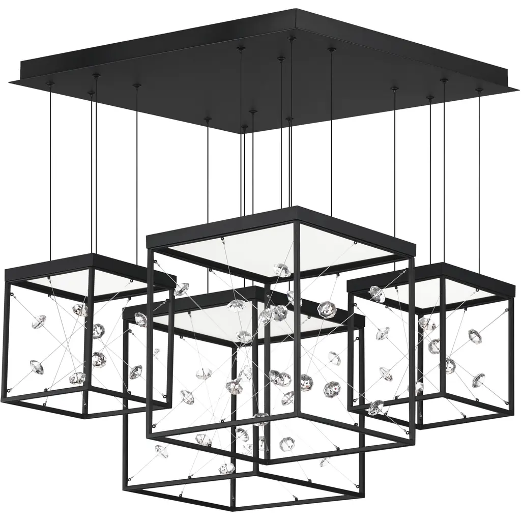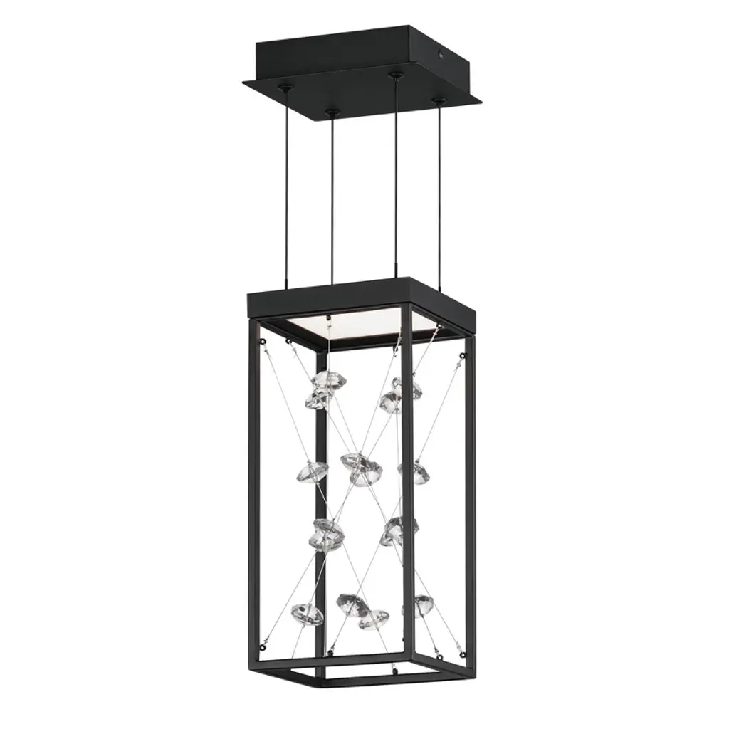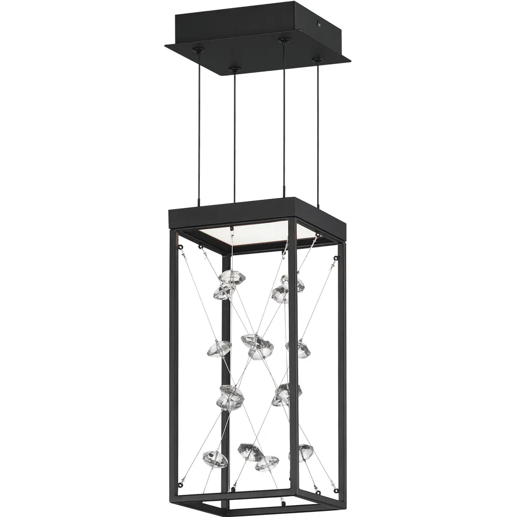 A network of wire and crystal are suspended within a box frame illuminated from above. The light panel above highlights the iridescence of the crystal while providing ample illumination to the space below. Material: Crystal, Finish Color: Black, Width: 11.75", Height: 12.75", Length: 41.75", Lamping Type: LED, Number Of Bulbs: 1, Wattage: 39.5 Watts, Cri: 90, Color Temperature: 3000 Kelvin, Lumens: 1570, Dimmable: Yes, Moisture Rating: Dry Rated