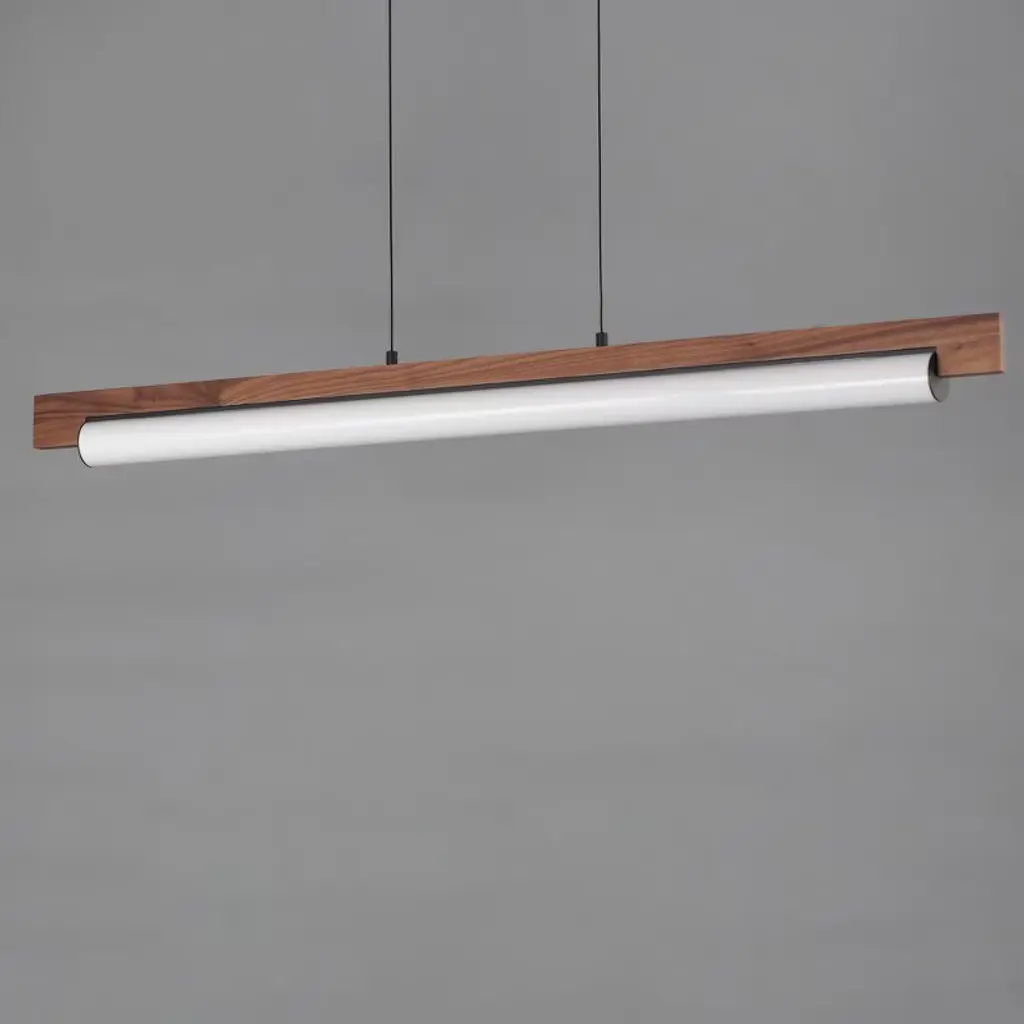 Lengths of wood in Walnut finish frame an LED omnidirectional light source. Whether surface mounted or suspended as a pendant, this collection provides a natural touch to an otherwise modern, minimalist design. Material: Aluminum, Finish Color: Walnut/Black, Width: 2", Height: 4", Length: 45.25", Lamping Type: LED, Number Of Bulbs: 1, Wattage: 28 Watts, Cri: 90, Color Temperature: 3000 Kelvin, Lumens: 1680, Dimmable: Yes, Moisture Rating: Dry Rated