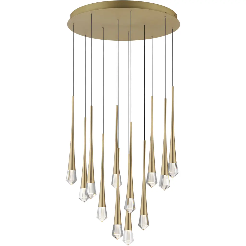 An elongated profile with piercing statement, this series of pendants feature thin black wires that support a tapered metal pendant. Recessed in this form is a high powered LED that illuminates a brilliantly faceted crystal element with etched details inside its form to capture light and enhance its beauty. Available in Gold or Matte Black, the design complements both modern and many transitional interiors. A coordinating ADA compliant wall sconce was designed with a rigid stem for public spaces and has been sealed for use in damp locations.