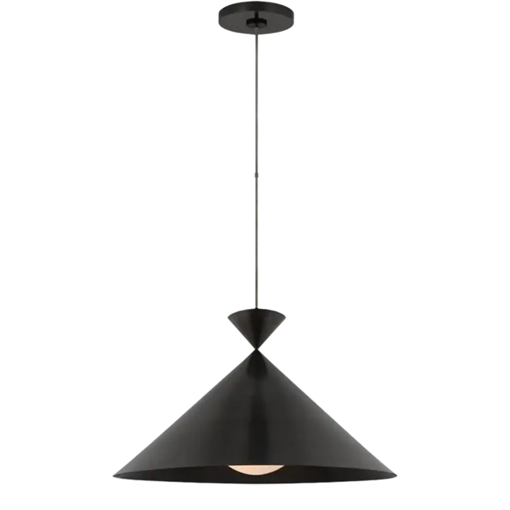 Sleek and simply, the effortlessly chic oversized cone pendants add a modern touch to elevate your space. A surprisingly bright single light source is recessed within a secondary smaller aperture cone shade painted white on its interior to reflect more and beam additional lighting downward without glare. This distinctive cut off accentuates the black finish on the surfaces between two cones. Available in Black and Antique Brass, this pendant series exemplifies the enduring elegance of the cone form in design.