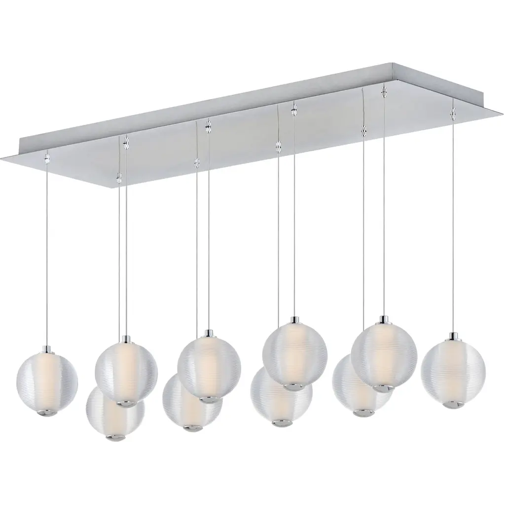 Ablaze with omnidirectional LED light radiating from the center of perfectly ribbed spheres, the lustrous glow within accentuates the repeating pattern on the glass' exterior. With minimal hardware visible outside the glass, select from Polished Chrome or Gold to match your interior's decor. Material: Steel, Finish Color: Polished Chrome, Width: 11", Height: 5", Length: 33.5", Lamping Type: LED, Number Of Bulbs: 10, Wattage: 5 Watts, Cri: 90, Color Temperature: 3000 Kelvin, Lumens: 2500, Dimmable: Yes, Moisture Rating: Dry Rated