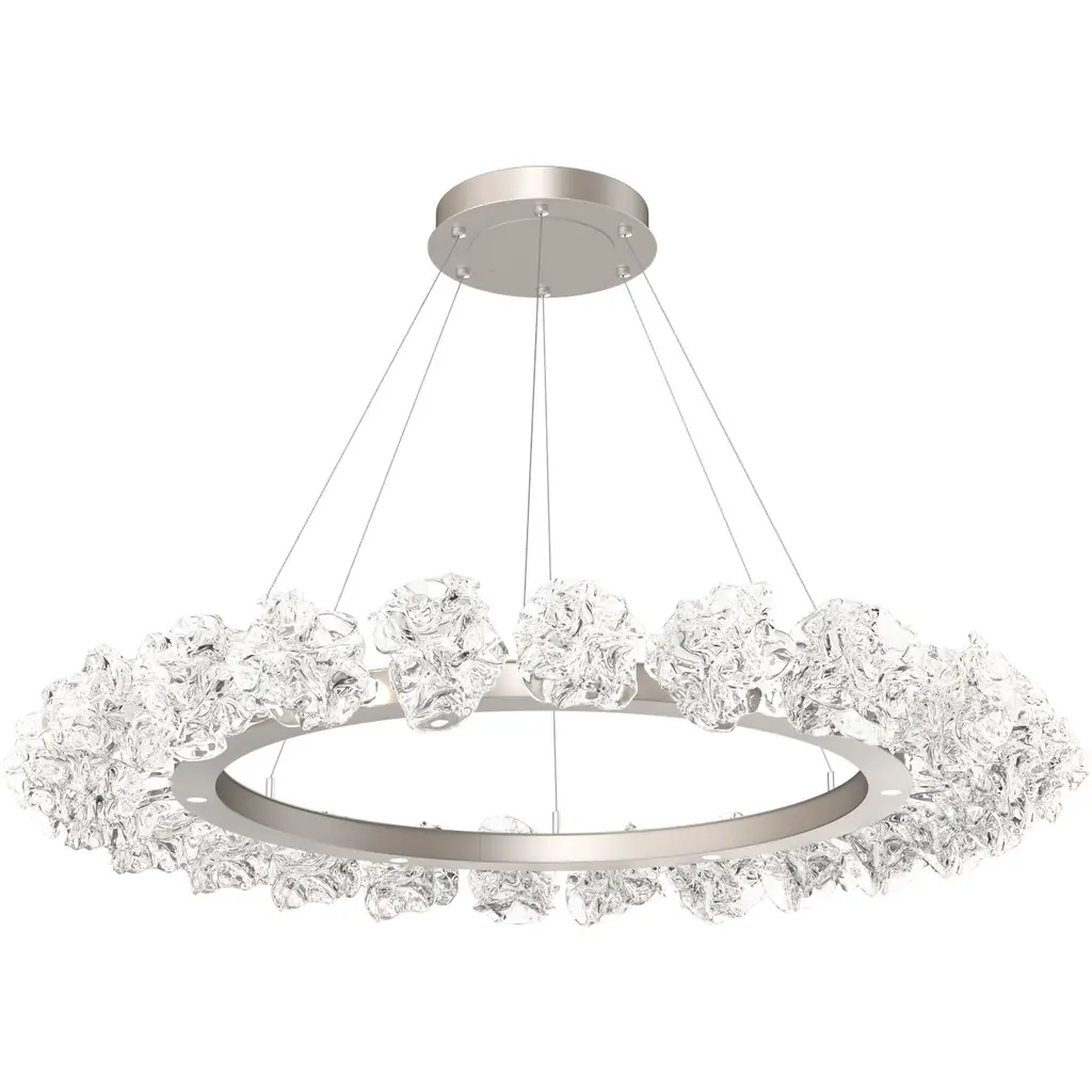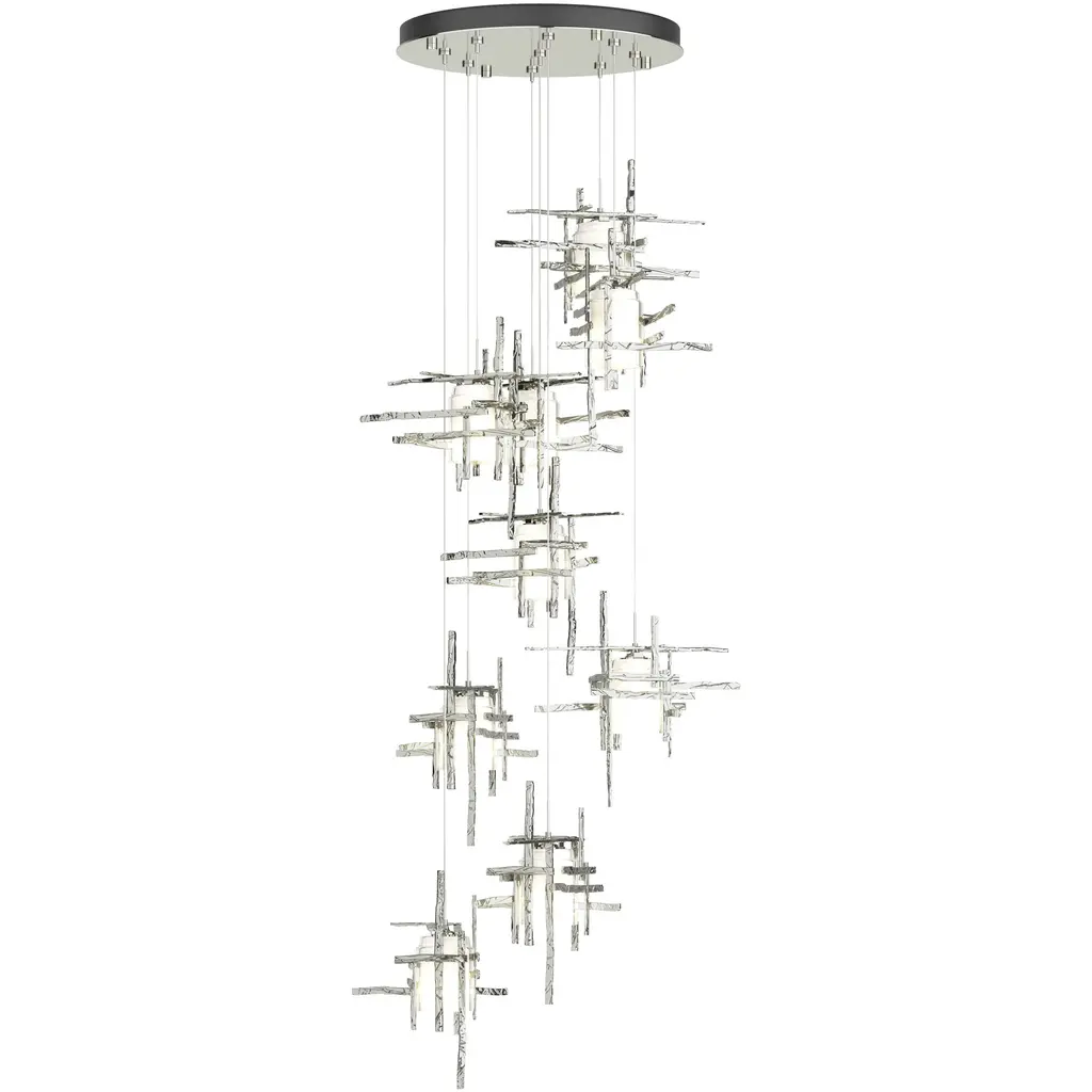 An airy arrangement of abstract forms, the Rinkle pendants feature sheets of transparent acrylic shaped by hand. The light guided acrylic captures the glow of energy efficient LEDs recessed within strips of shining stainless steel, obscuring the source of illumination. Delicately suspended by a series of thin wires, the pendants appear to be floating in an adjustable configuration of weightless light sculpture. Available in Polished Chrome and Brushed Gunmetal, its unique design adds an artistic statement to a variety of interiors with complimentary finishes.