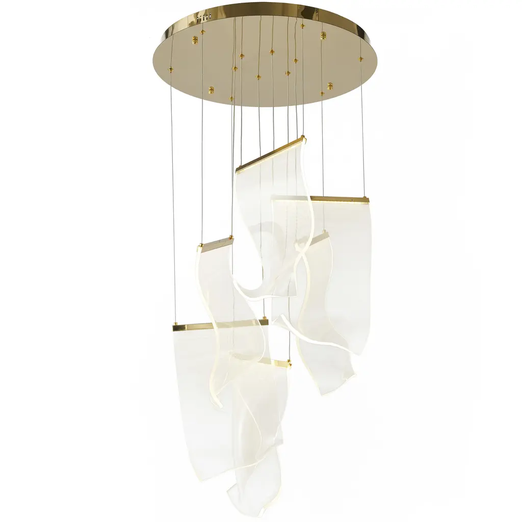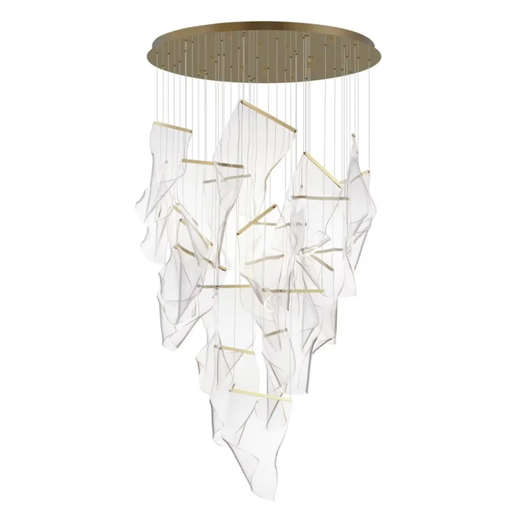 An airy arrangement of abstract forms, the Rinkle pendants feature sheets of transparent acrylic shaped by hand. The light guided acrylic captures the glow of energy efficient LEDs recessed within strips of shining stainless steel, obscuring the source of illumination. Delicately suspended by a series of thin wires, the pendants appear to be floating in an adjustable configuration of weightless light sculpture. Available in Polished Chrome, French Gold, and Brushed Gunmetal, its unique design adds a showstopping element to interior spaces.