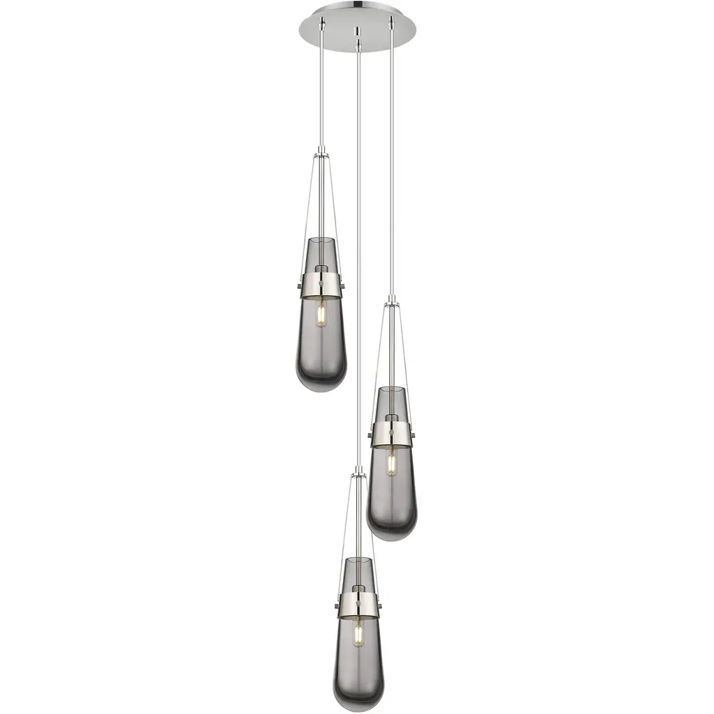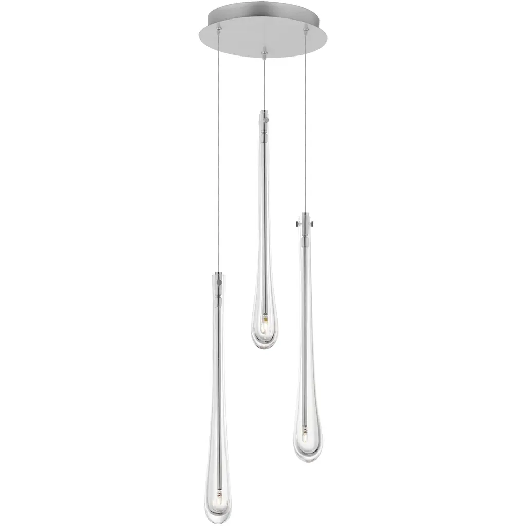 The classic teardrop glass shade is elevated in a luxurious collection of pendant configurations using substantially dense glass that are hand blown in elongated forms and curated into various color combinations. Suspended within the long, slender glass is a similarly long and slender socket to illuminate an energy efficient LED G4 lamp at the base of the glass. The slender tube running within the glass also supports the glass with elegantly flat thumb screws in coordinating finishes. Choose from Matte Black metal with Mirror Smoked glass for a moodier ambience, crystal Clear glass that accentuates the thickness of the glass walls paired with transitional Satin Nickel metalwork, or celebrate the design with effervescent Bubble glass and plated Gold metalwork.