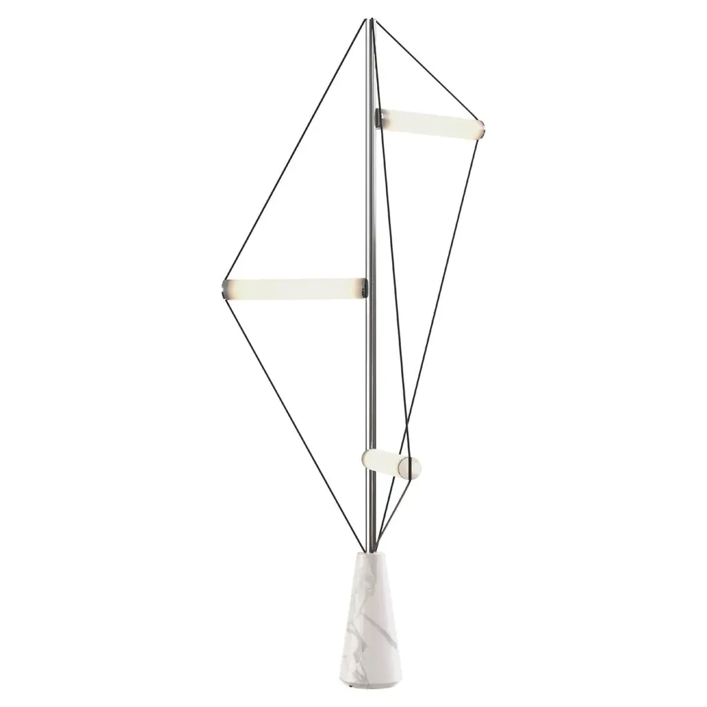 The Etat-des-Lieux 3A LED Multi-Light Pendant by Darmes is a stunning composition of hand blown glass with an innovative support system that was designed by Alexandre Joncas. Inspired by the landscape outside the D’Armes studio and the reflection of the Laurentian Mountains in nearby waters, the smooth, shapely silhouette of glass shades provide a playful space for an anodized aluminum and frosted glass module to shine within. A flexible, wide, and conductive strap made exclusively for Etat-des-Lieux suspends each piece, providing an elegant touch to this composition and powering each module, bringing this design to life.