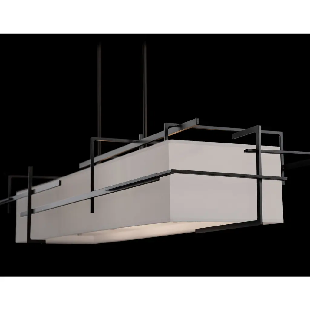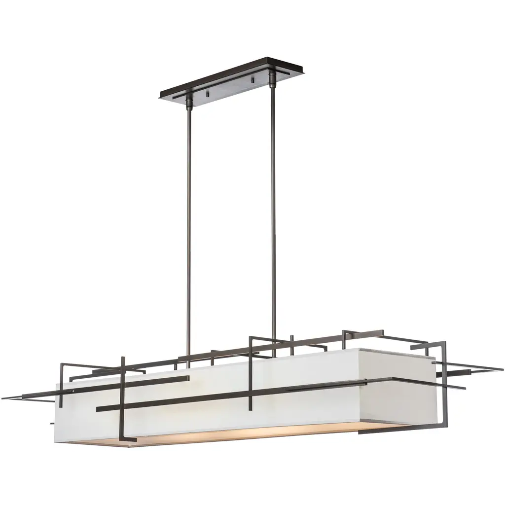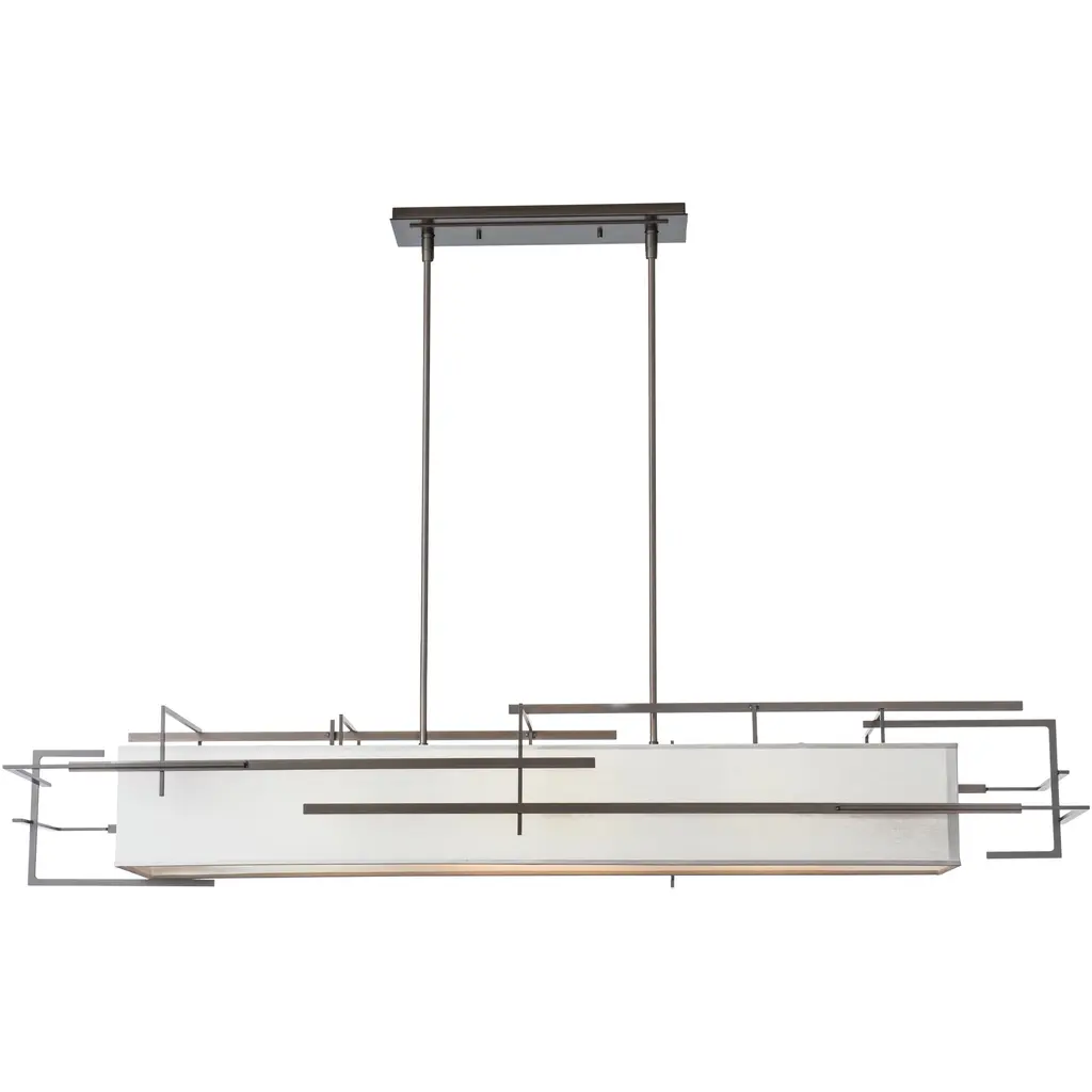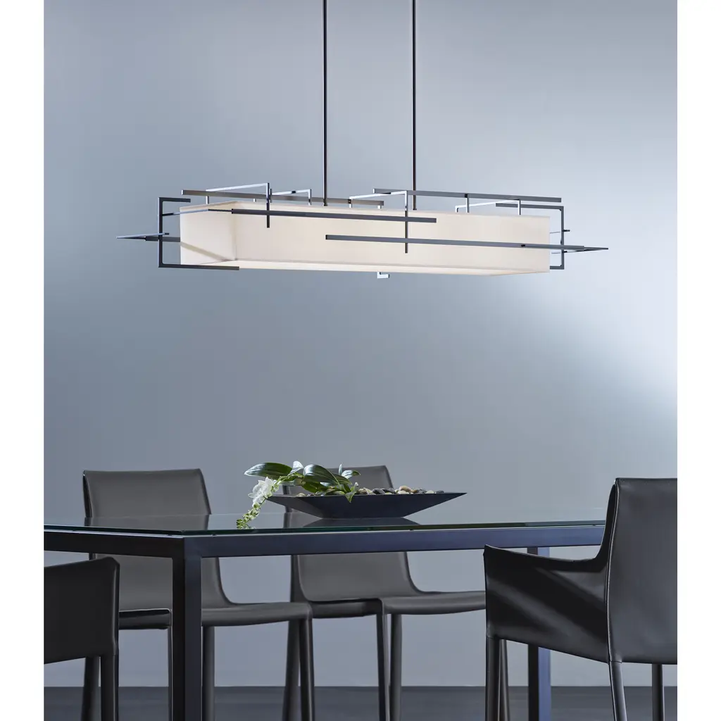 A modern take on a classic form, the Etch Pendant is full 54" in width. A classic, rectangular shade is held within an abstract, Mondrian-esque hand-forged steel exoskeleton with clean lines and angles. An impressive and versatile lighting pendant is suited to a variety of design styles.