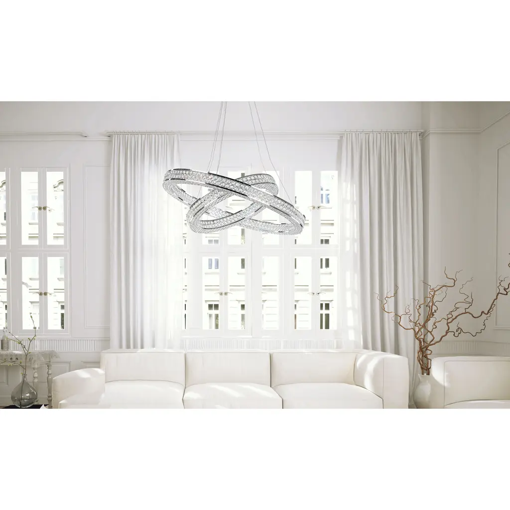 Frames of metal rings encased with Beveled Crystal Jewels, are finished in Polished Chrome. Suspended by cables as if floating In air, these rings cast rainbows of light when illuminated by the Integrated LED.