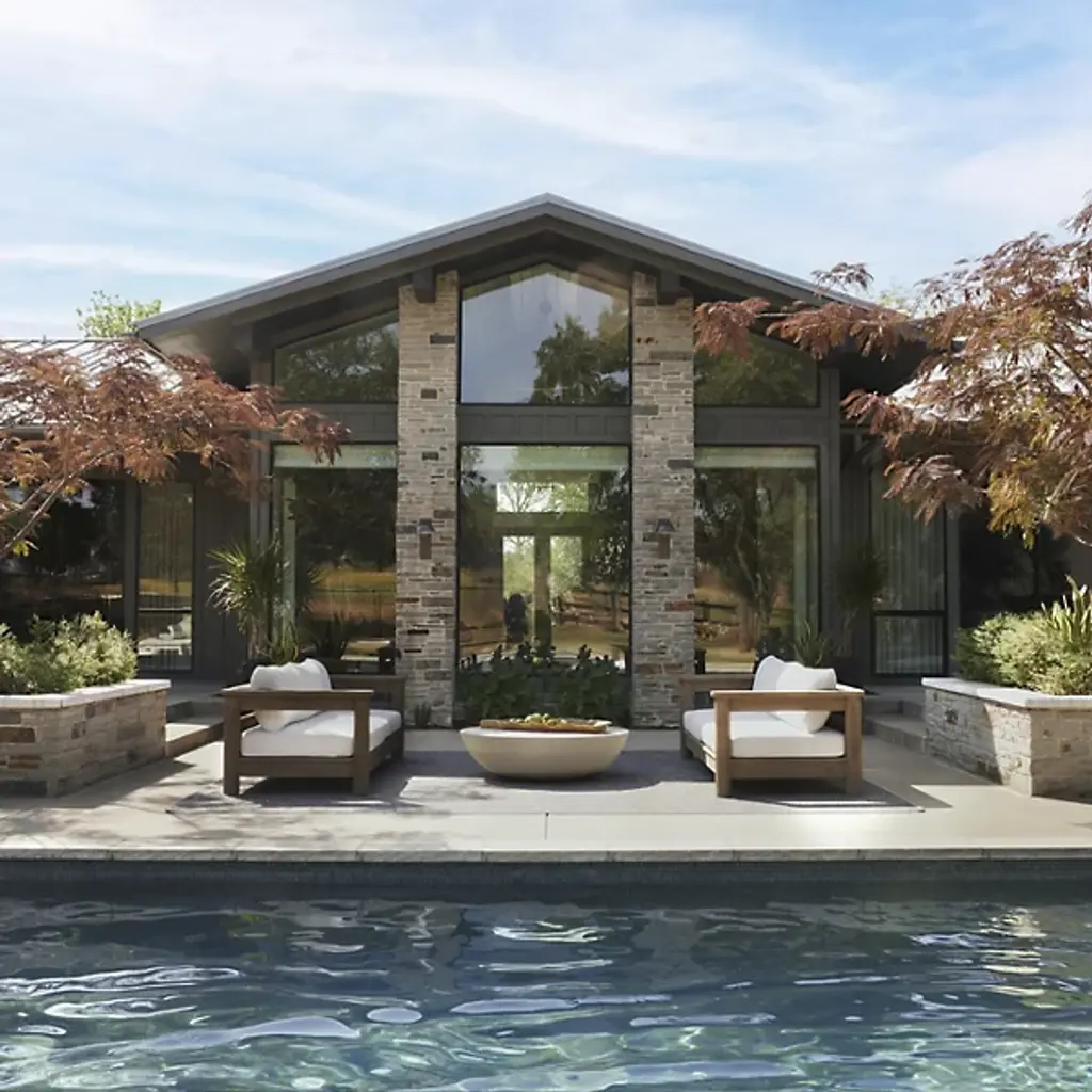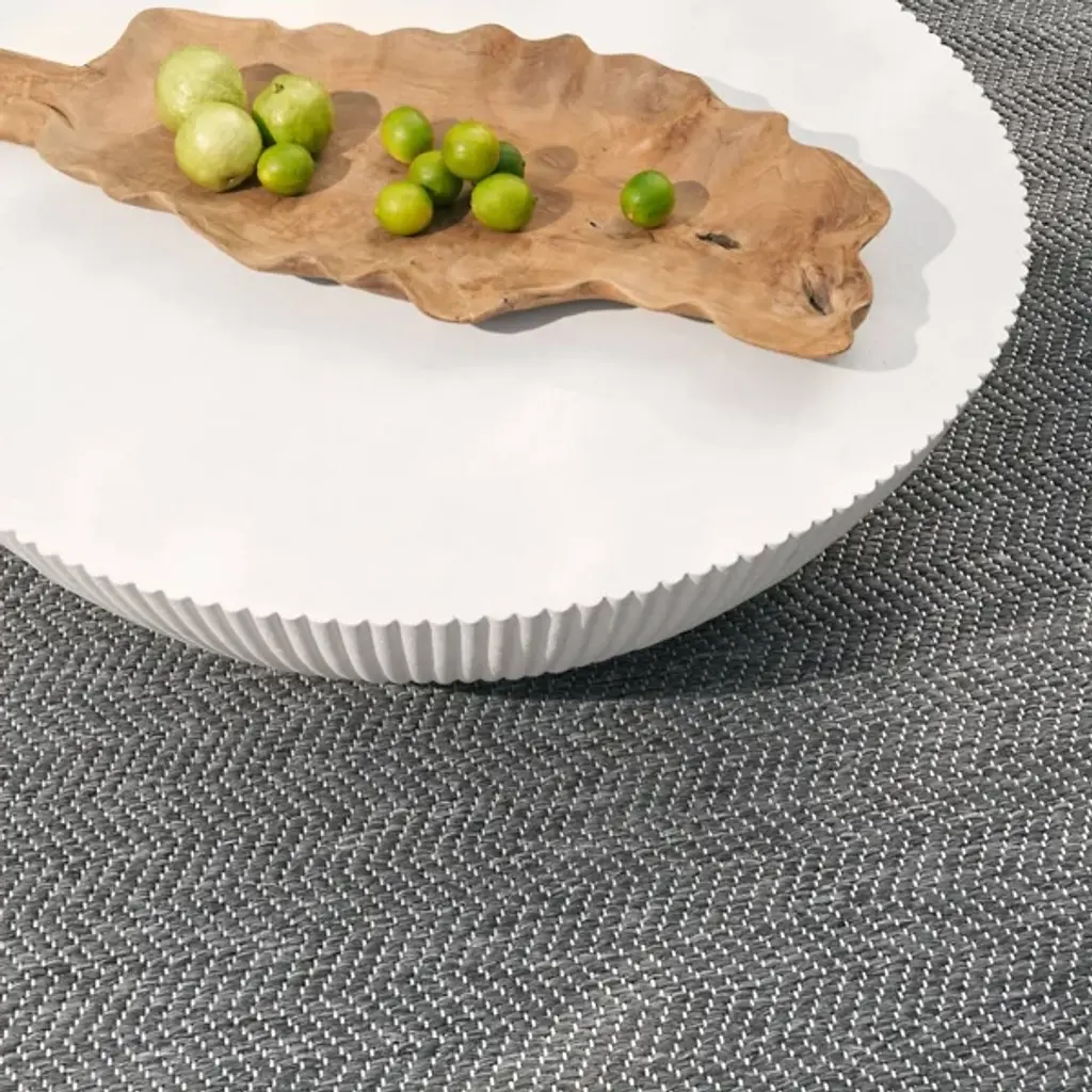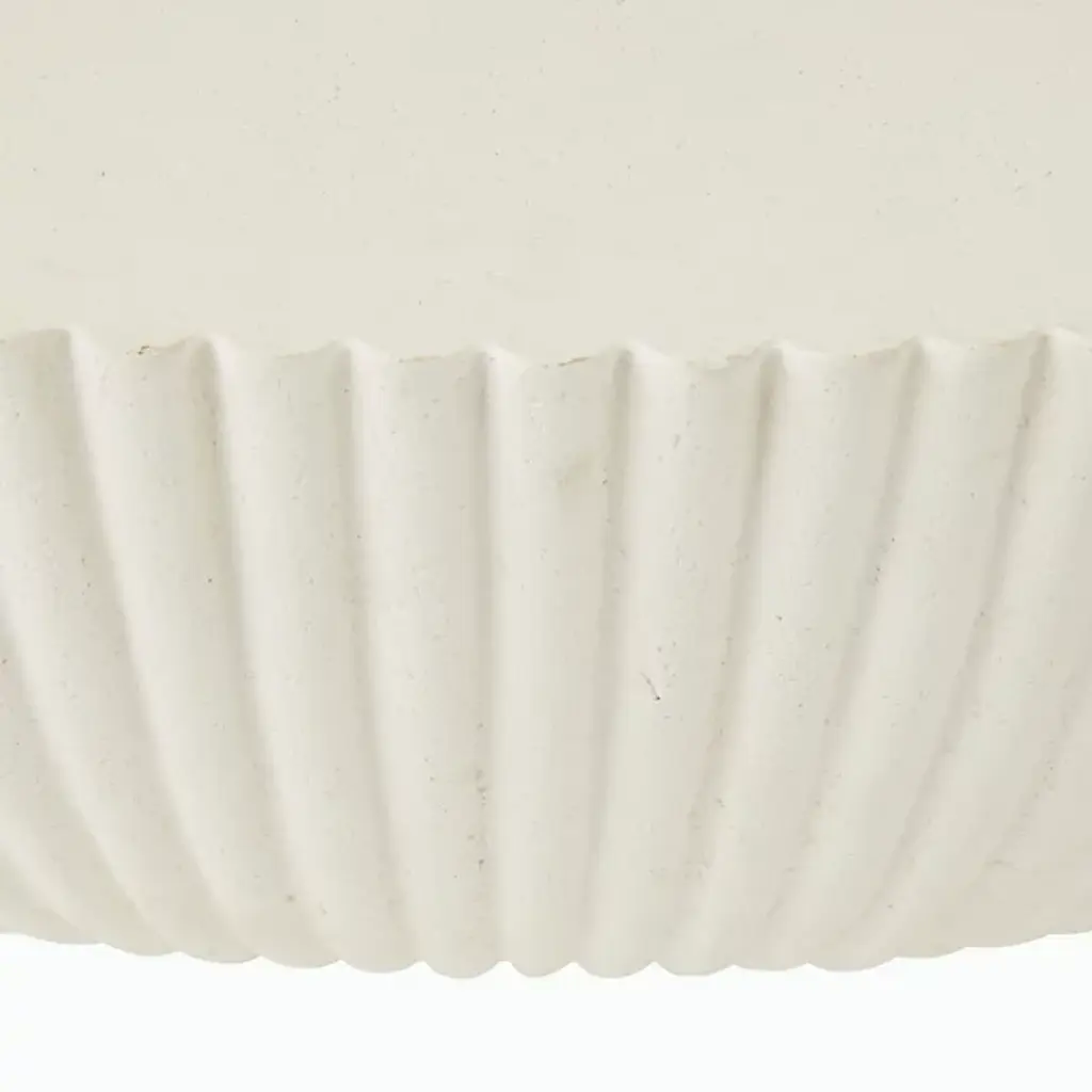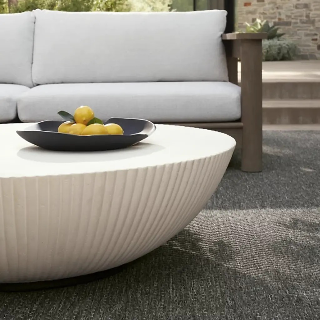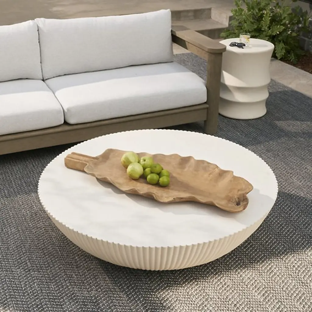 The Etta Outdoor Coffee Table from Arteriors presents a low-profile drum style that works equally well in contemporary outdoor rooms or transitional spaces. Formed from ivory concrete composite, this piece features fluting details that taper down gracefully to meet the metal base beneath. The simple drum shape provides a generous surface area for drinks, books, or serving pieces during outdoor entertaining. Use this table to anchor seating arrangements on patios or position it in garden settings where the fluted details catch changing light throughout the day.