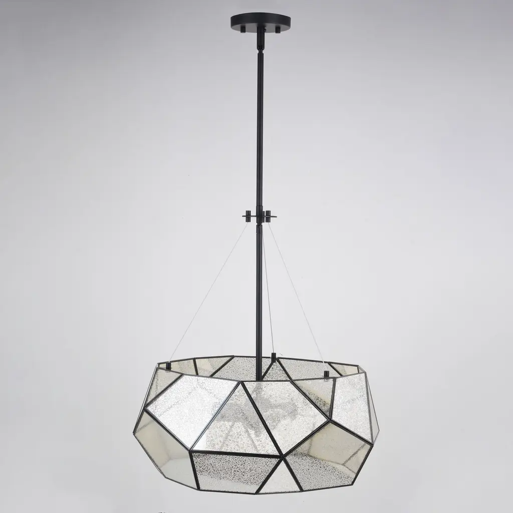 Faceted glass defines the dramatic beauty of the Euclid indoor lighting collection. Black finish pairs with asymmetric panels of mercury glass for a perfect contemporary take on a mid-century modern classic. Combine that with vintage Edison style filament bulbs to complete the look. Height is adjustable with the included downrods compatible with vaulted ceilings. This pendant would be a stunning addition to any entryway, bedroom, family room, kitchen, dining area, or foyer.
