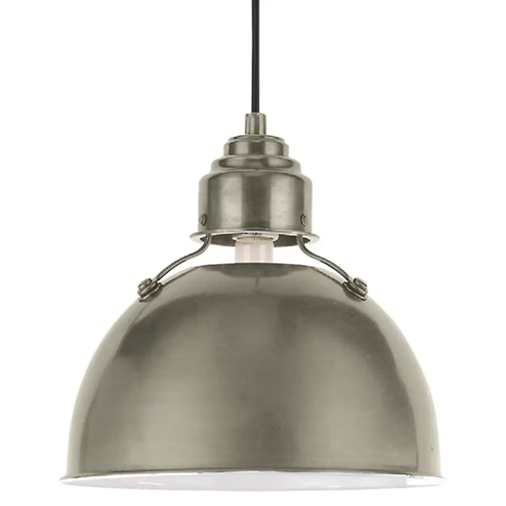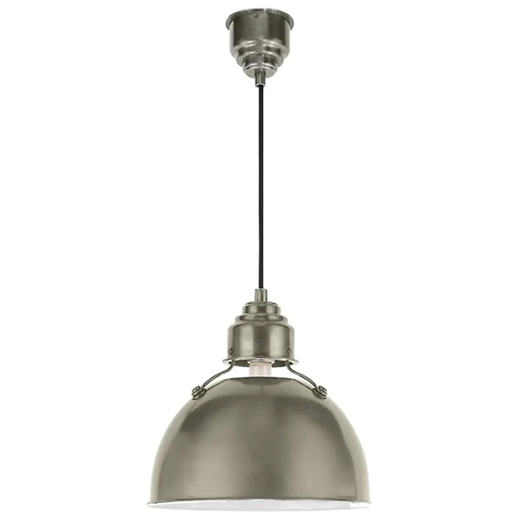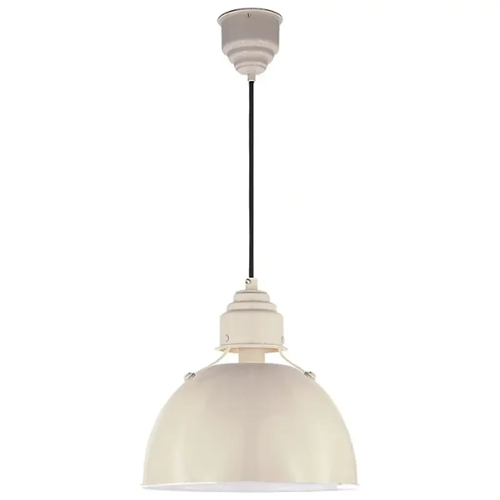 The Eugene Pendant Light by Visual Comfort Signature, formerly known as Visual Comfort, refines classic design and delivers it to your chosen space. A detailed, concentric, round ceiling canopy and black cord add touches of finesse to this metal socket and hanging shade. A white shade interior helps direct and reflect light downward toward its subject. Plays well alone, or install with others for a more complex look. Dimmable with a standard incandescent dimmer (not included).
