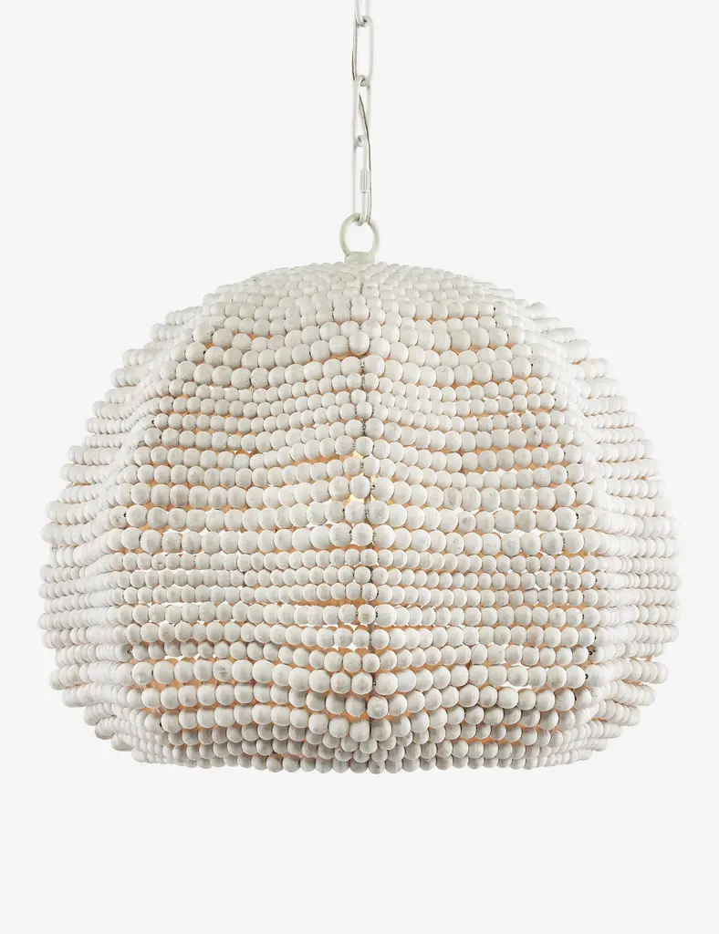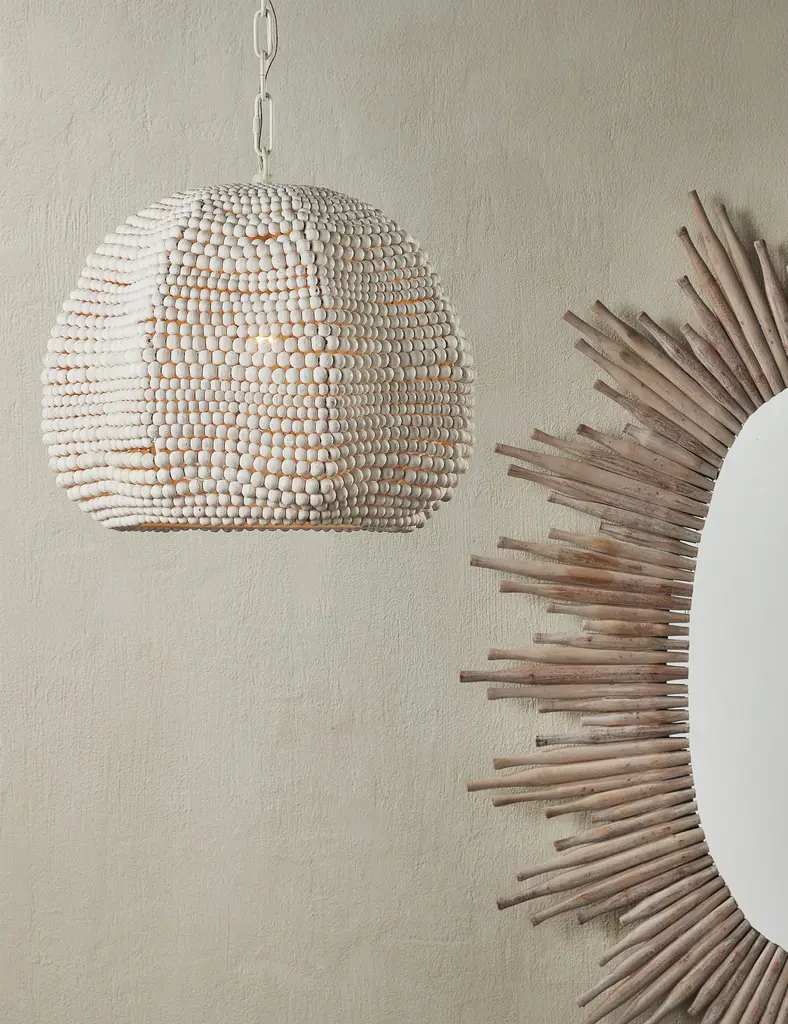 Style a signature touch overhead with the Eulalie pendant light. Its design features wood beads strung along a metal frame creating a flowing organic form bursting with a chic textural character. This unique hanging light is set for statement appeal with a laid-back coastal charm.