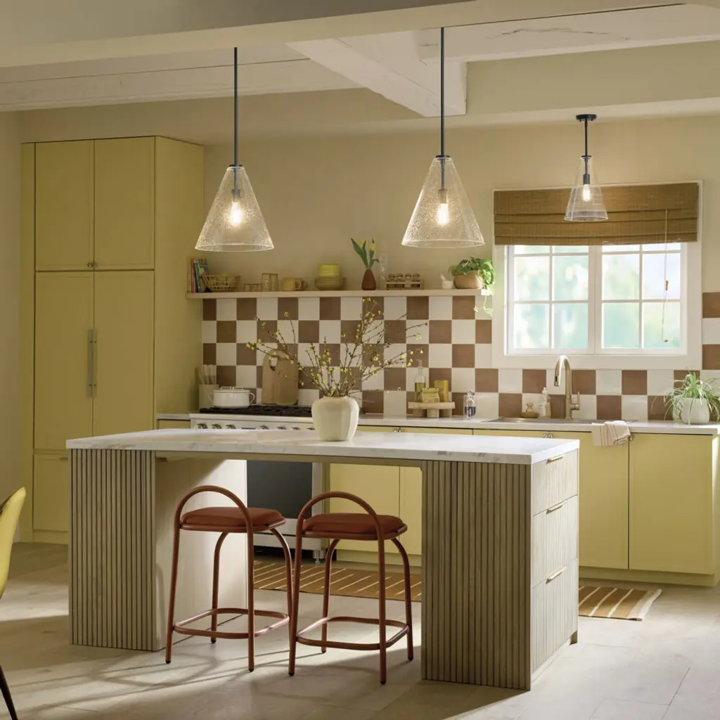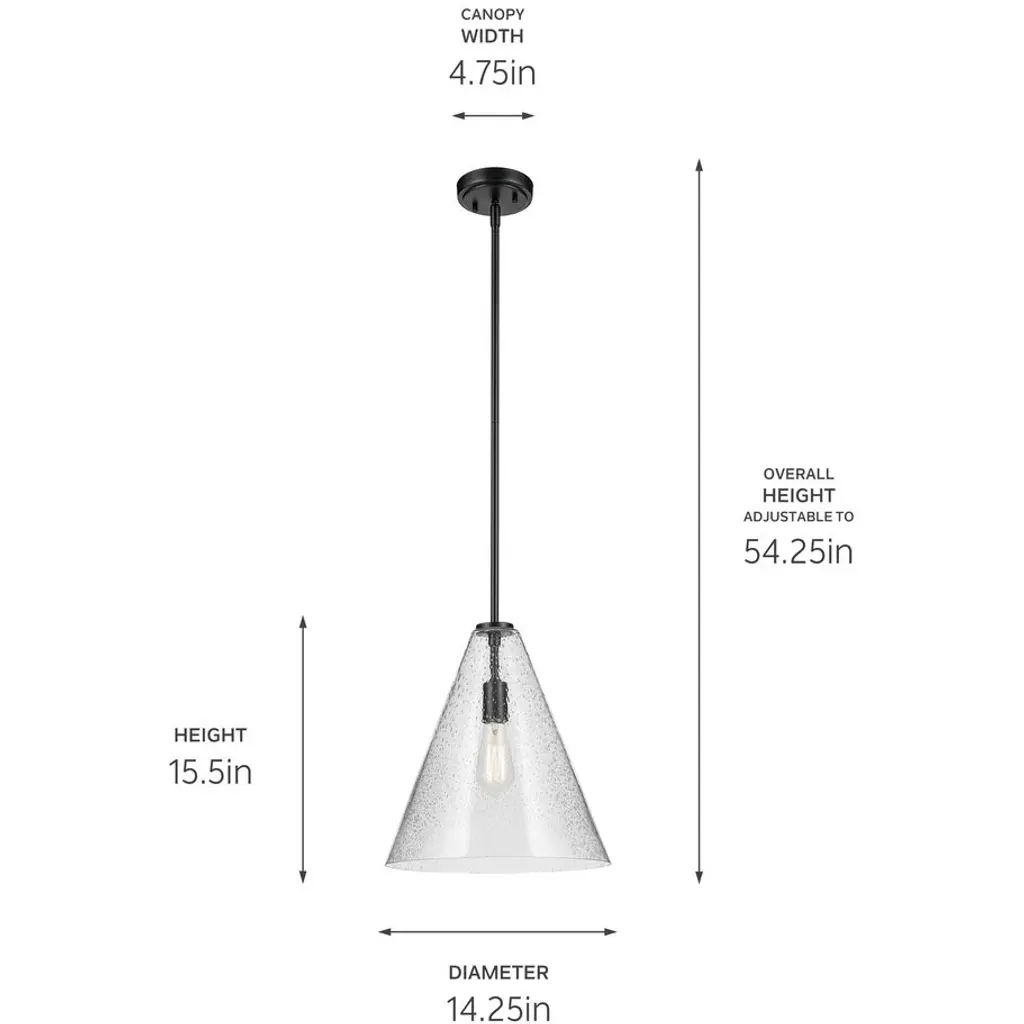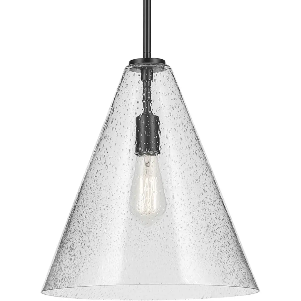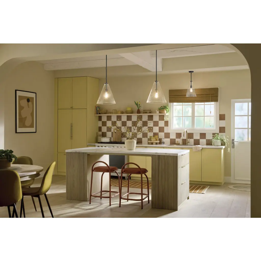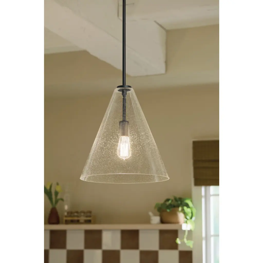 A modern style with minimal detailing, the Everly 1-light pendant easily elevates the style of soft modern environments. This elegant pendant offers a conical form and contemporary, clear seeded glass that creates a soft, ambient glow, adding warmth as it shines. As beautiful as it is versatile, adjust the hanging height to meet the needs of your space