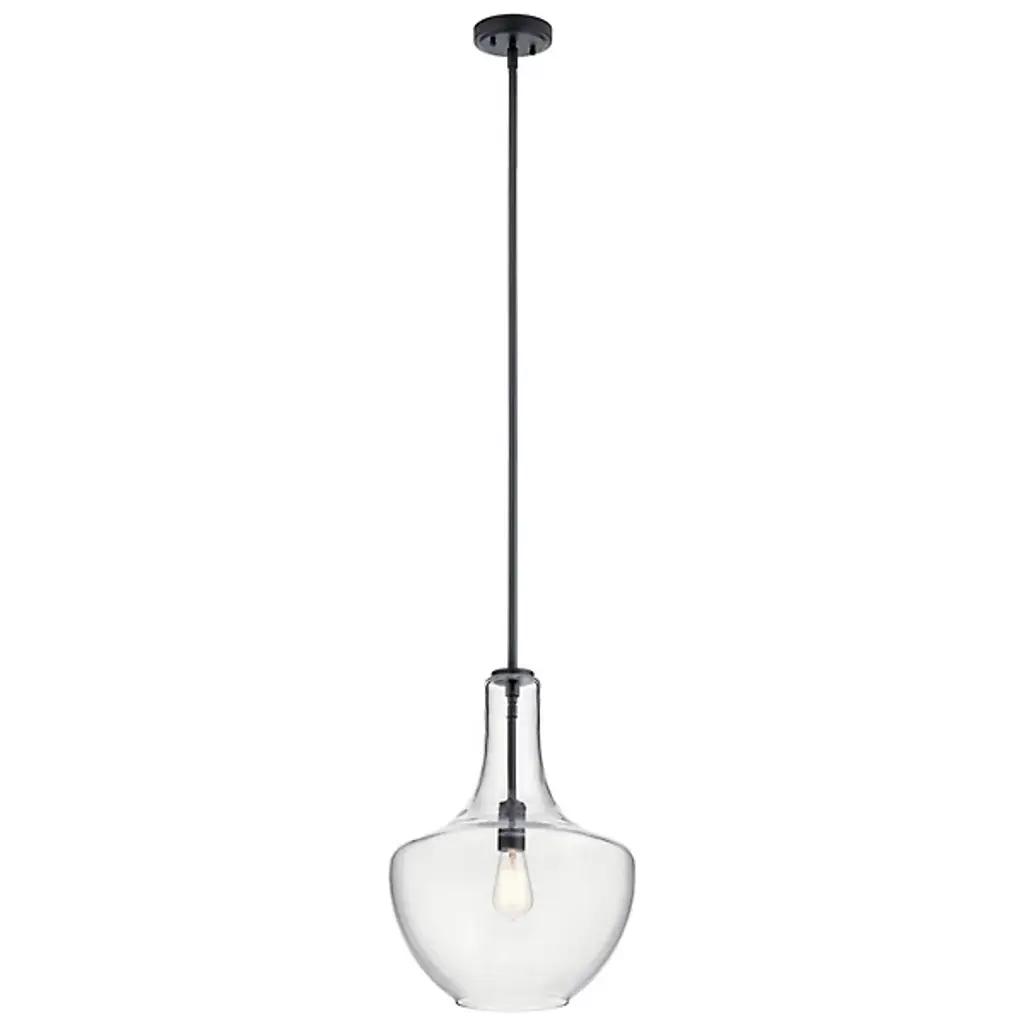 Blown decorative glass containers inspired the design of the highly decorative Kichler Everly Pendant. The wide curves of the Clear glass shade evoke the shape of a classic table lamp and provide a pleasingly soft outline around the exposed bulb within. For warm, vintage twinkle, use with a classic Edison incandescent bulb.